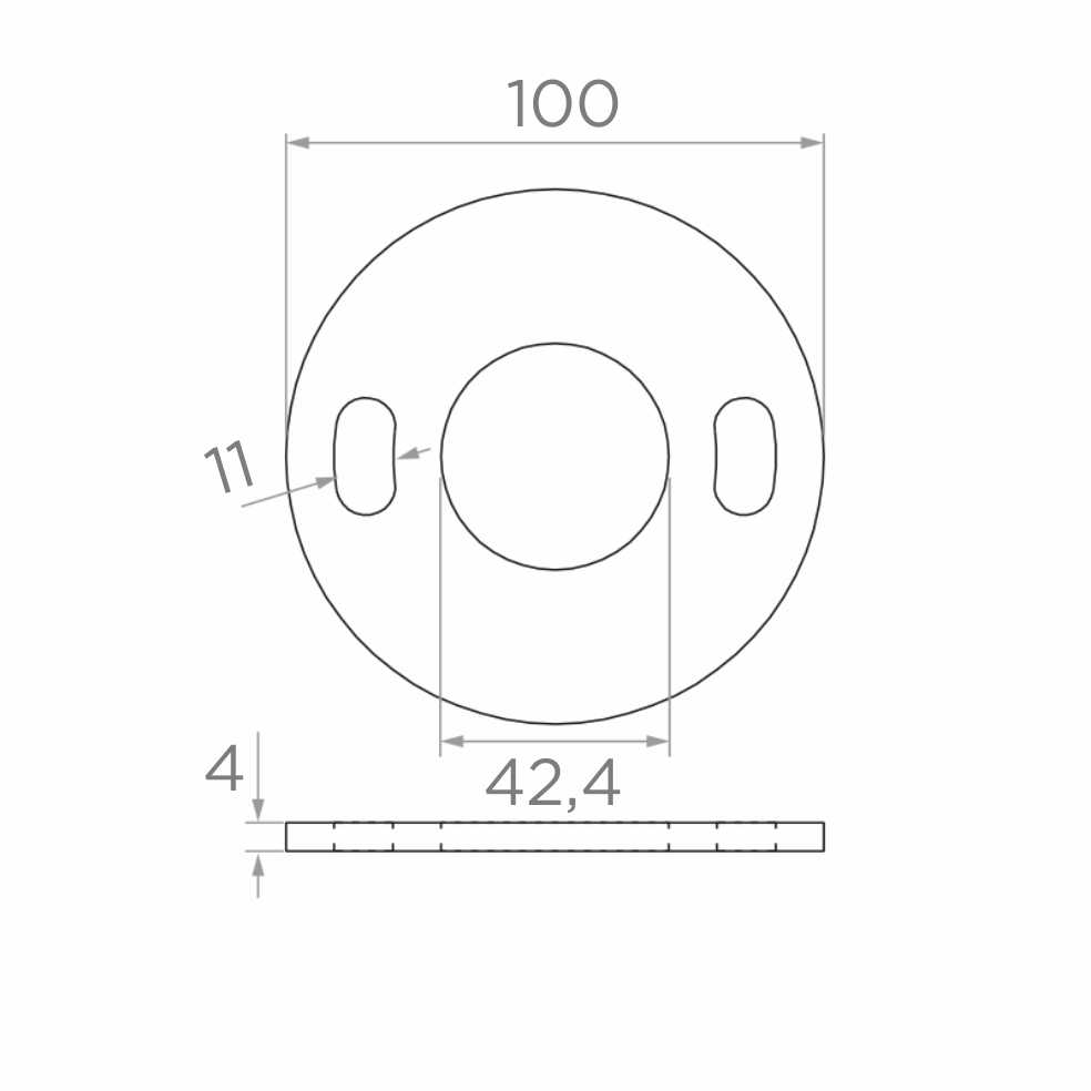 La base est destinée au soudage — le poteau tubulaire de diamètre 42,4 mm s'insère dans le trou central et se raccorde de manière permanente par soudure, ce qui garantit une stabilité et une résistance maximales de toute la construction. Deux trous de montage oblongs permettent de visser la base au support avec une certaine tolérance de réglage, facilitant un montage précis même en présence de petites irrégularités.