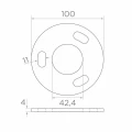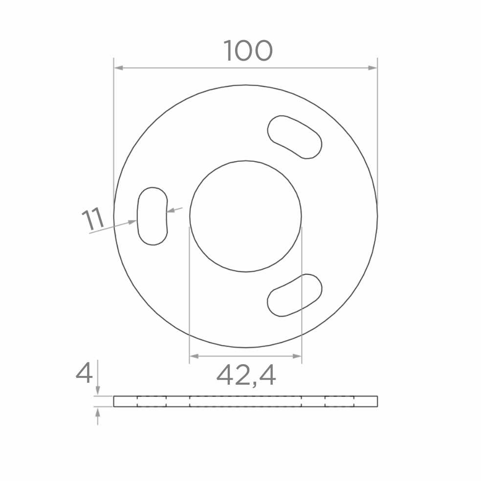 La base fixe le poteau circulaire de balustrade au support par méthode de soudage. Quatre trous de montage de type oblong permettent l'ajustement de la position des vis, ce qui facilite considérablement le positionnement précis du poteau lors du montage. Le trou central de diamètre 42,4 mm est adapté aux tubes de balustrade standards du système 42,4. Les points de montage peuvent être recouverts d'un cache spécial (disponible séparément), assurant une finition esthétique de la construction.