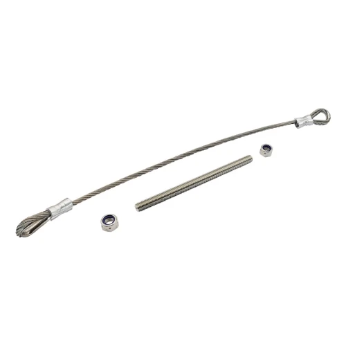Le câble est monté entre le vantail du portail et le poteau ou le cadre. Dans des conditions normales d'exploitation, il reste légèrement détendu et ne supporte pas de charges. En situation d'urgence — par exemple lors de la rupture d'une charnière — le câble reprend le poids du vantail et empêche sa chute, protégeant les personnes et les biens se trouvant à proximité. Le kit est complet et prêt à monter — il contient le câble avec cosses, la tige filetée M12×180 mm et deux écrous autobloquants.