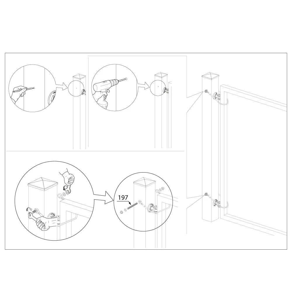 Le câble se monte entre le poteau et le vantail du portail. Le montage nécessite de percer des trous dans le poteau et le cadre du vantail, puis de fixer les œillets du câble à l'aide de vis avec rondelles. Chaque œillet du câble est renforcé d'une cosse en acier, ce qui protège contre l'usure et prolonge la durée de vie. Tout le processus d'installation est rapide et ne nécessite pas d'outils spécialisés — une perceuse et une clé suffisent.