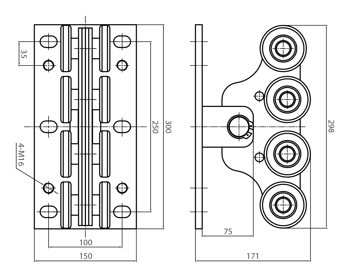 - Platine de montage avec perçages : 4× M16
