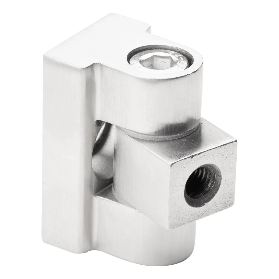 Charnière 180° pour fixation verre en acier inoxydable AISI 304 avec finition satiné — élément destiné au montage professionnel de constructions en verre en système plat. Permet l'ouverture du verre sur toute la plage 180° (90° de chaque côté), ce qui permet de concevoir librement cloisons, portes et cabines en verre sans limitations d'angle d'ouverture.
