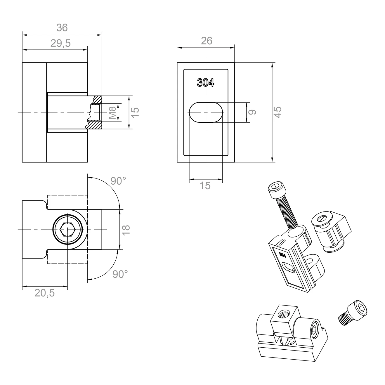 La charnière est montée sur des surfaces planes par vissage avec filetage M8. Cette méthode assure une haute résistance de la liaison, une facilité d'installation et de démontage éventuel — sans nécessité d'utiliser d'outils spécialisés. Le trou oblong dans le corps permet le réglage de la position du verre dans une plage de 9 mm, ce qui facilite le positionnement précis du panneau de verre lors du montage.