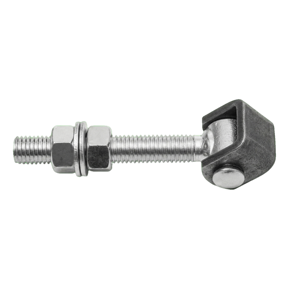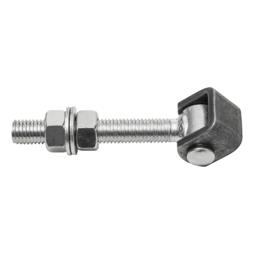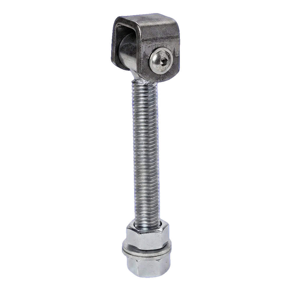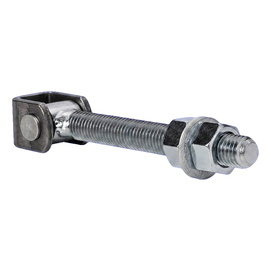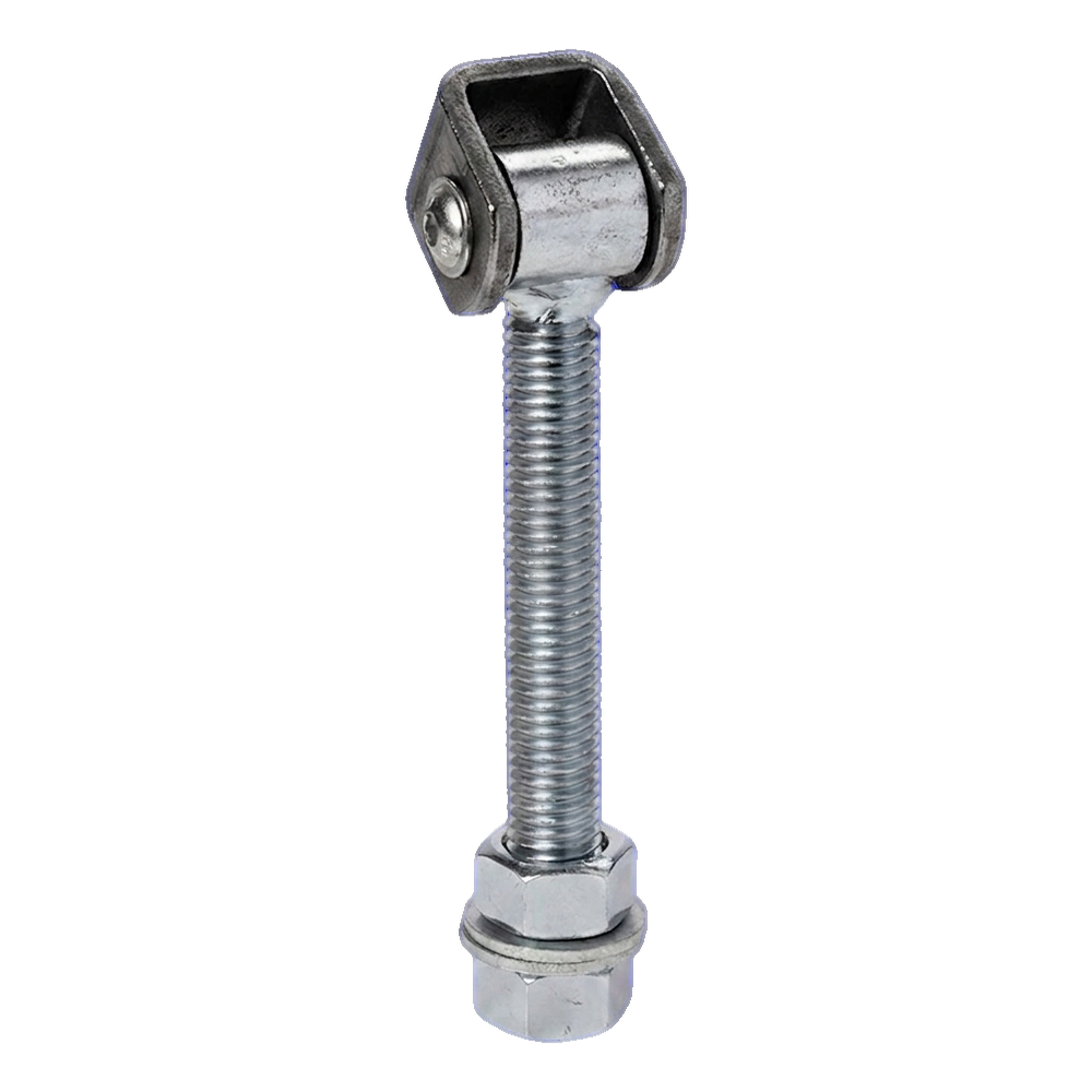 La tige filetée ainsi que les écrous sont fabriqués en acier galvanisé, ce qui assure une protection efficace contre l'humidité et les agents atmosphériques. L'œil de la charnière est en acier noir — avant le montage, il est recommandé de le protéger en plus avec une laque ou une peinture anticorrosion, ce qui permettra d'uniformiser la protection de tout l'élément et de prolonger sa durée de vie.
