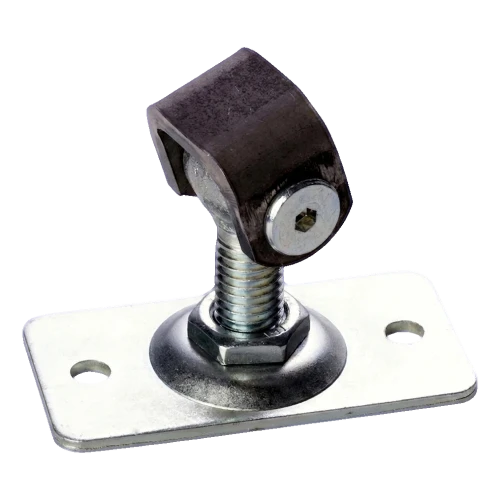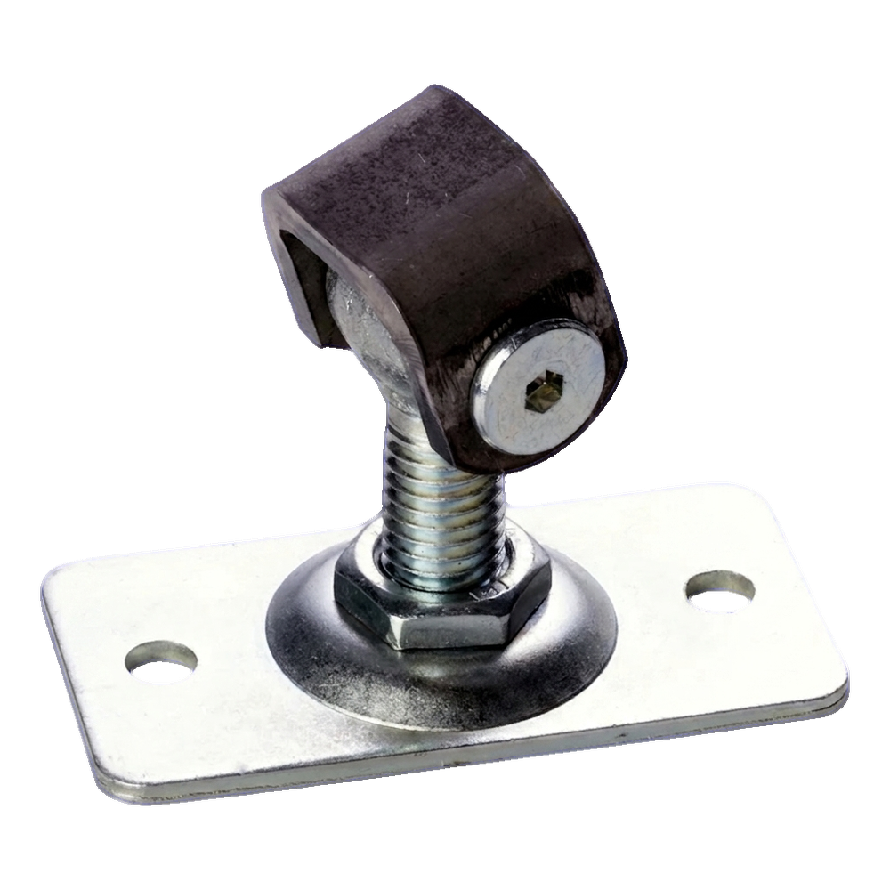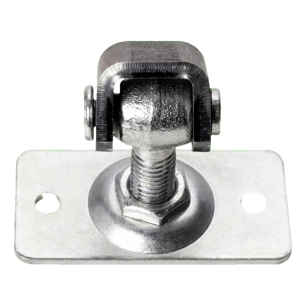 La plaque rectangulaire avec quatre trous de montage assure une fixation stable et sûre au poteau ou au cadre. La vis filetée M12 permet un réglage progressif de l'extension dans la plage de 38–55 mm, donnant à l'installateur un contrôle total sur le positionnement du portillon par rapport au poteau. L'œil de la charnière tourne librement sur l'axe du pivot, assurant un fonctionnement fluide du vantail.