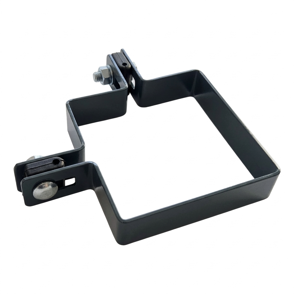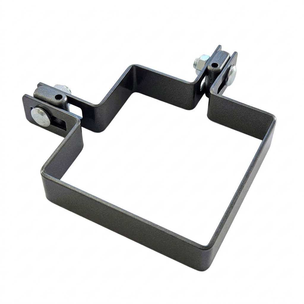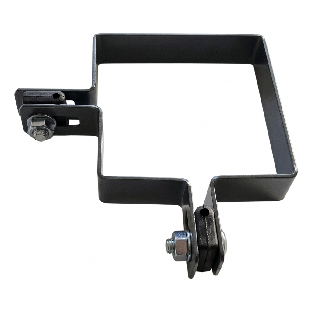 Le collier s'adapte parfaitement à la section du poteau 100×100 mm, ce qui garantit une liaison stable et sûre de la structure de clôture. Les trous de montage en forme de haricot permettent le réglage de position du panneau par rapport au poteau — facilitent l'alignement de la clôture même sur un terrain irrégulier.