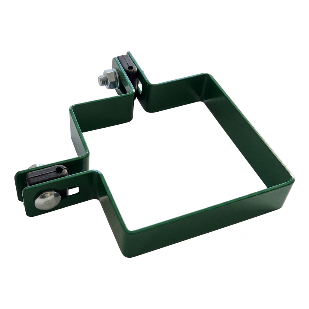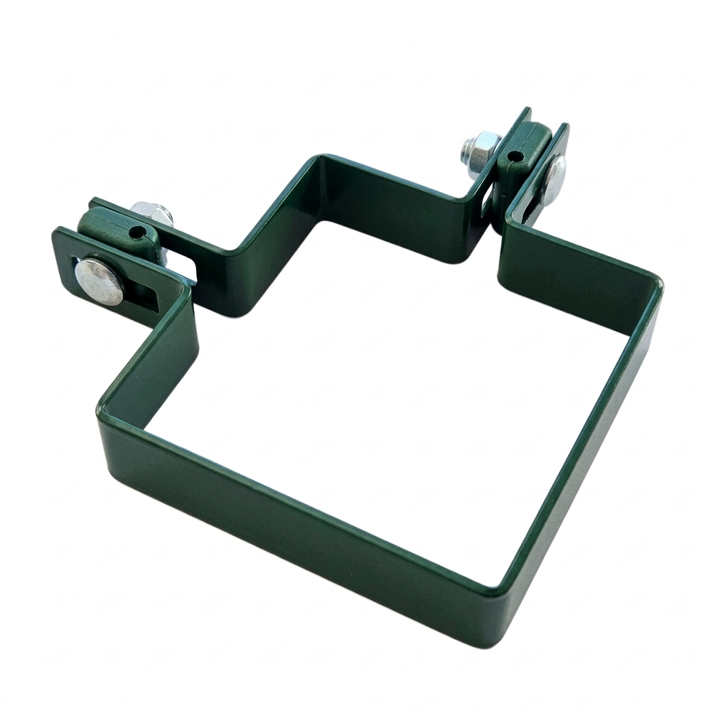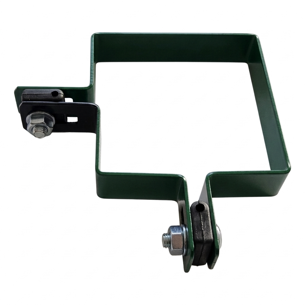 Le collier est parfaitement adapté à la section de poteau 100×100 mm, ce qui garantit une connexion stable et sûre de la structure de clôture. Les trous de montage en forme de haricot permettent l'ajustement de position du panneau par rapport au poteau — facilitent l'alignement de la clôture même sur terrain irrégulier.