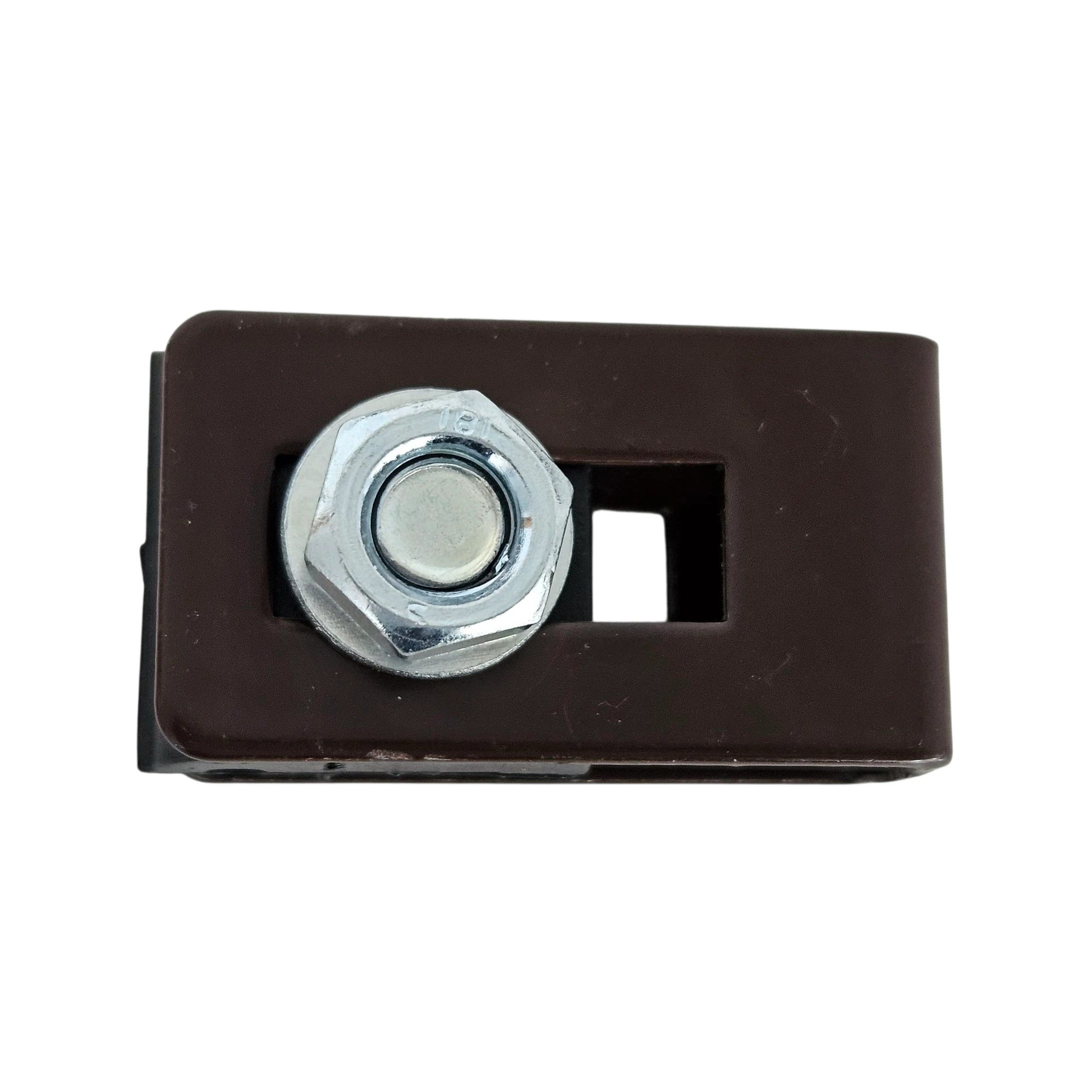 Collier universel support raccord pour panneaux de clôture bronze destiné aux poteaux de différentes sections grâce à sa forme universelle.