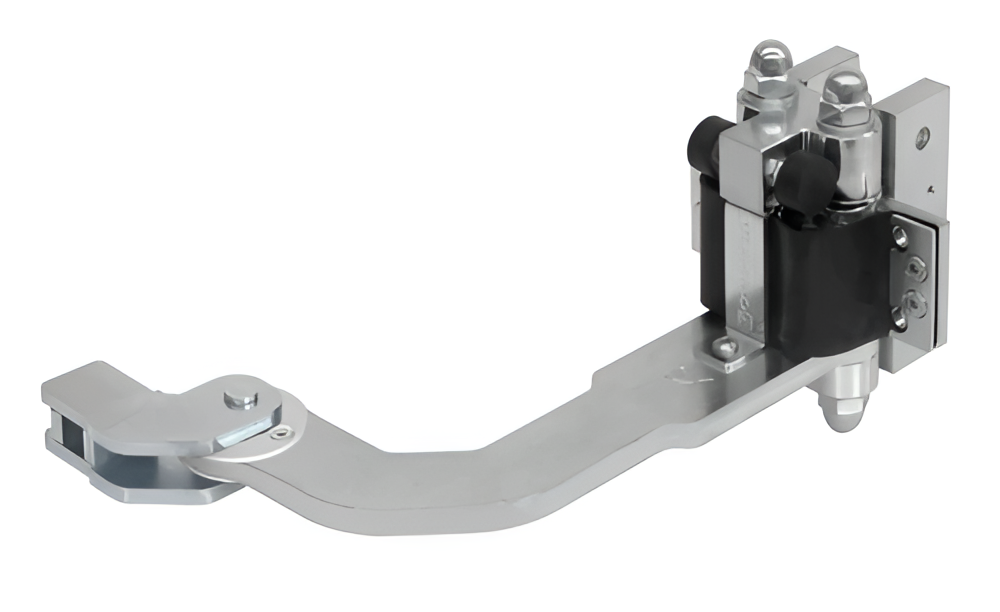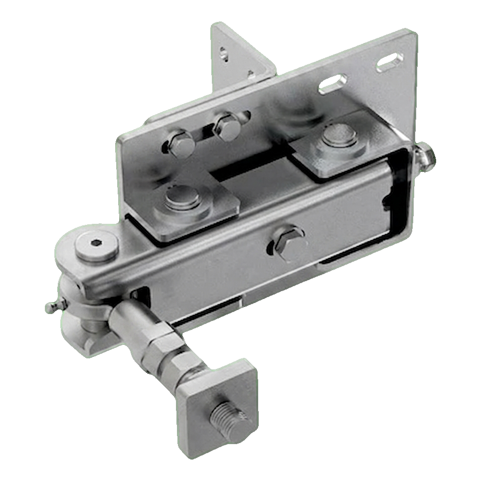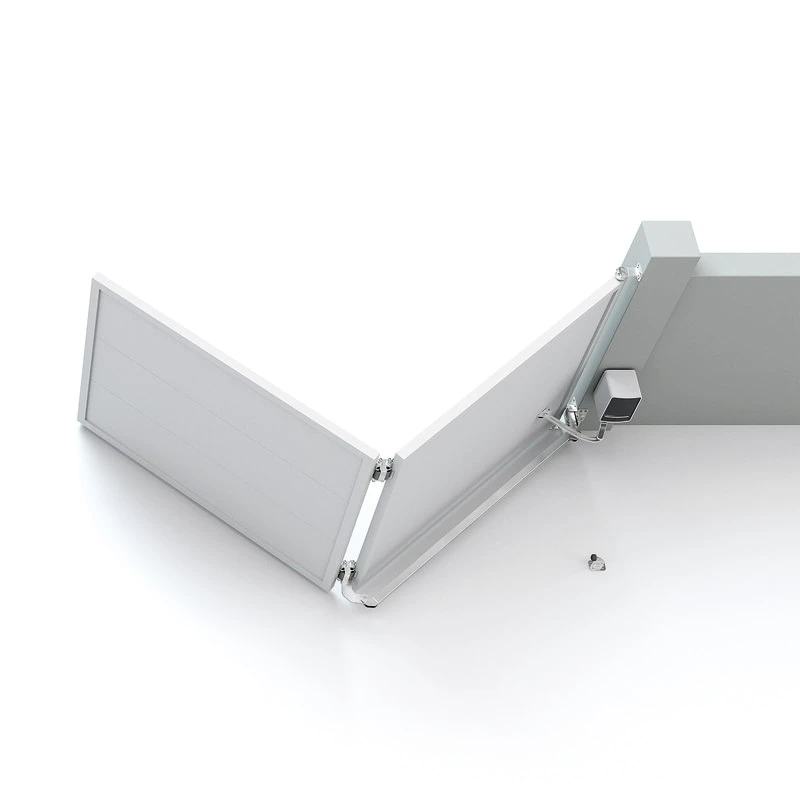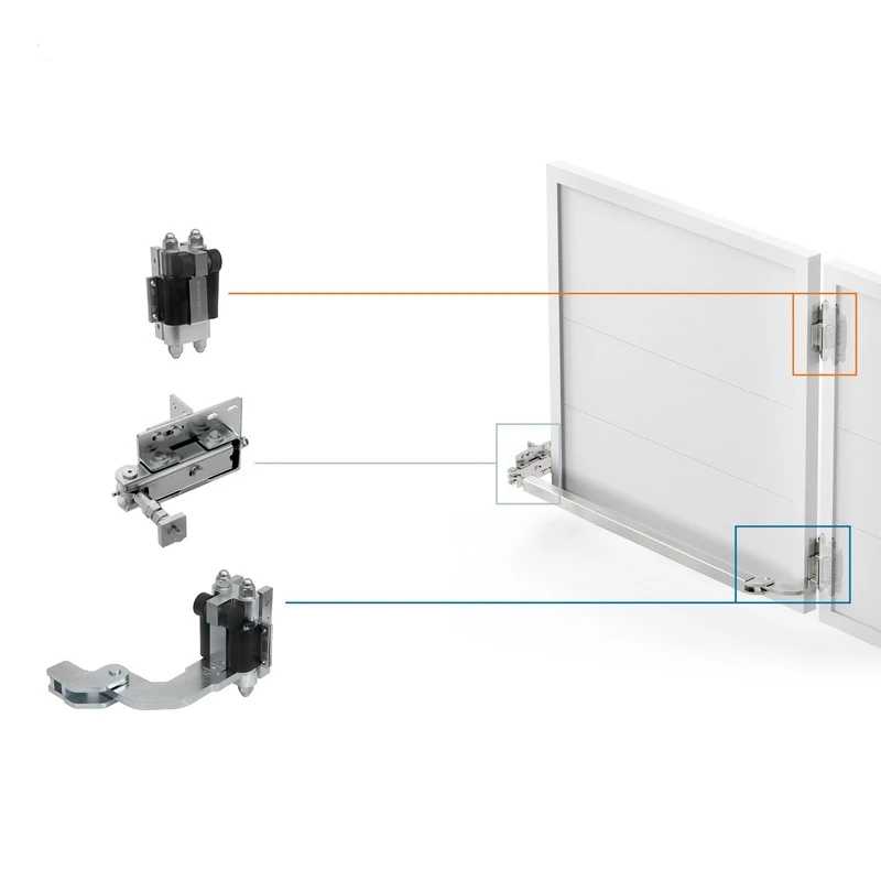- Charnière inférieure avec réducteur et bras — montée dans la partie inférieure du vantail du portail, responsable de l'entraînement du pliage ; bras de transmission pliable des deux côtés se connectant au bas du premier vantail