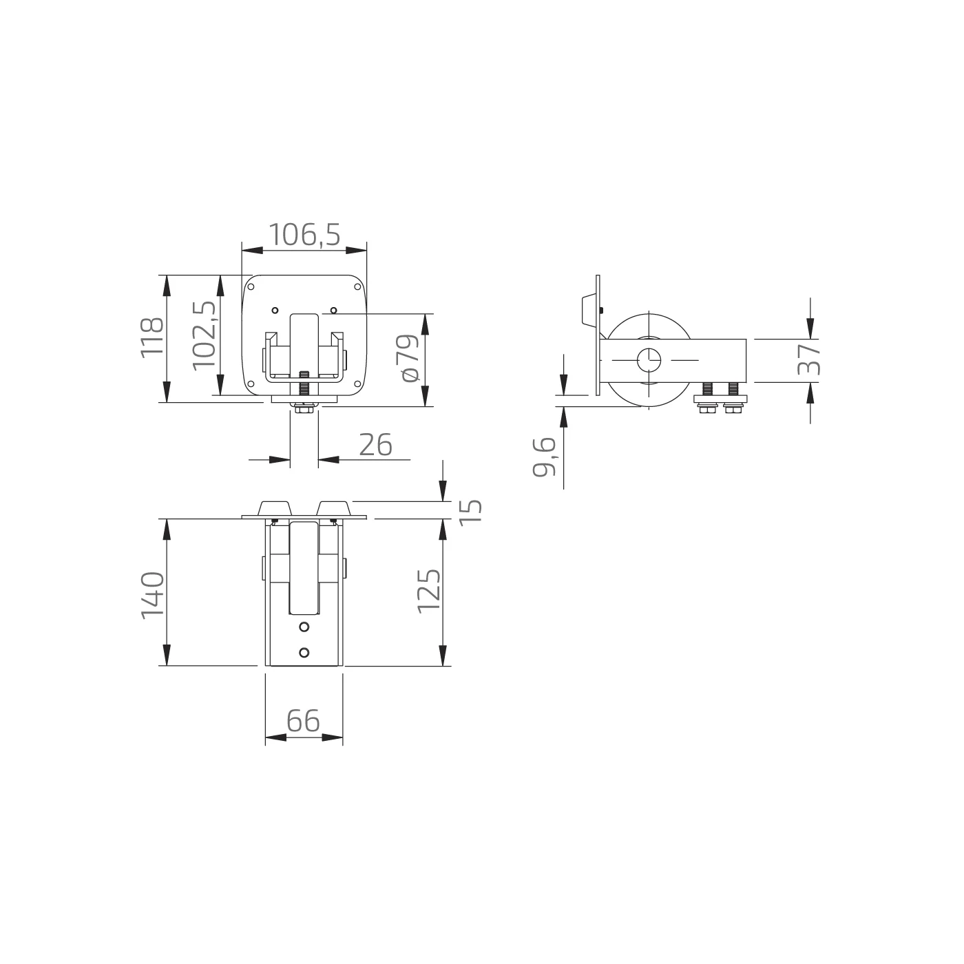 Le corps réalisé en acier galvanisé garantit une haute résistance à la corrosion même dans des conditions atmosphériques difficiles, et la roue en nylon de diamètre ø79 mm assure un fonctionnement silencieux et sans défaillance pendant de nombreuses années d'exploitation. Les dimensions compactes et le poids de seulement 1,25 kg minimisent la charge sur la structure du portail et facilitent le montage.
