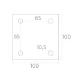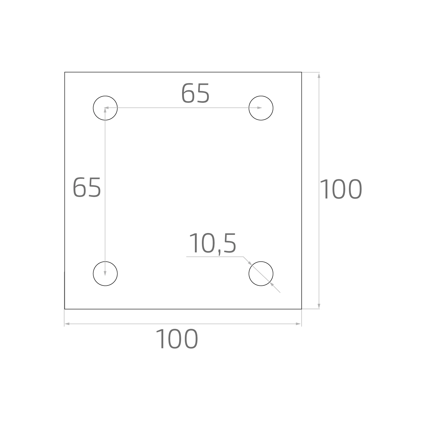 La platine de montage de dimensions 100 × 100 mm et d'épaisseur 4 mm avec quatre trous de montage assure une fixation stable et durable au poteau. Le corps de la charnière est galvanisé, ce qui garantit une haute résistance à la corrosion et permet une utilisation en extérieur. L'œil de la charnière est réalisé en acier noir (non galvanisé), ce qui constitue une solution standard dans ce type de quincaillerie de portail.