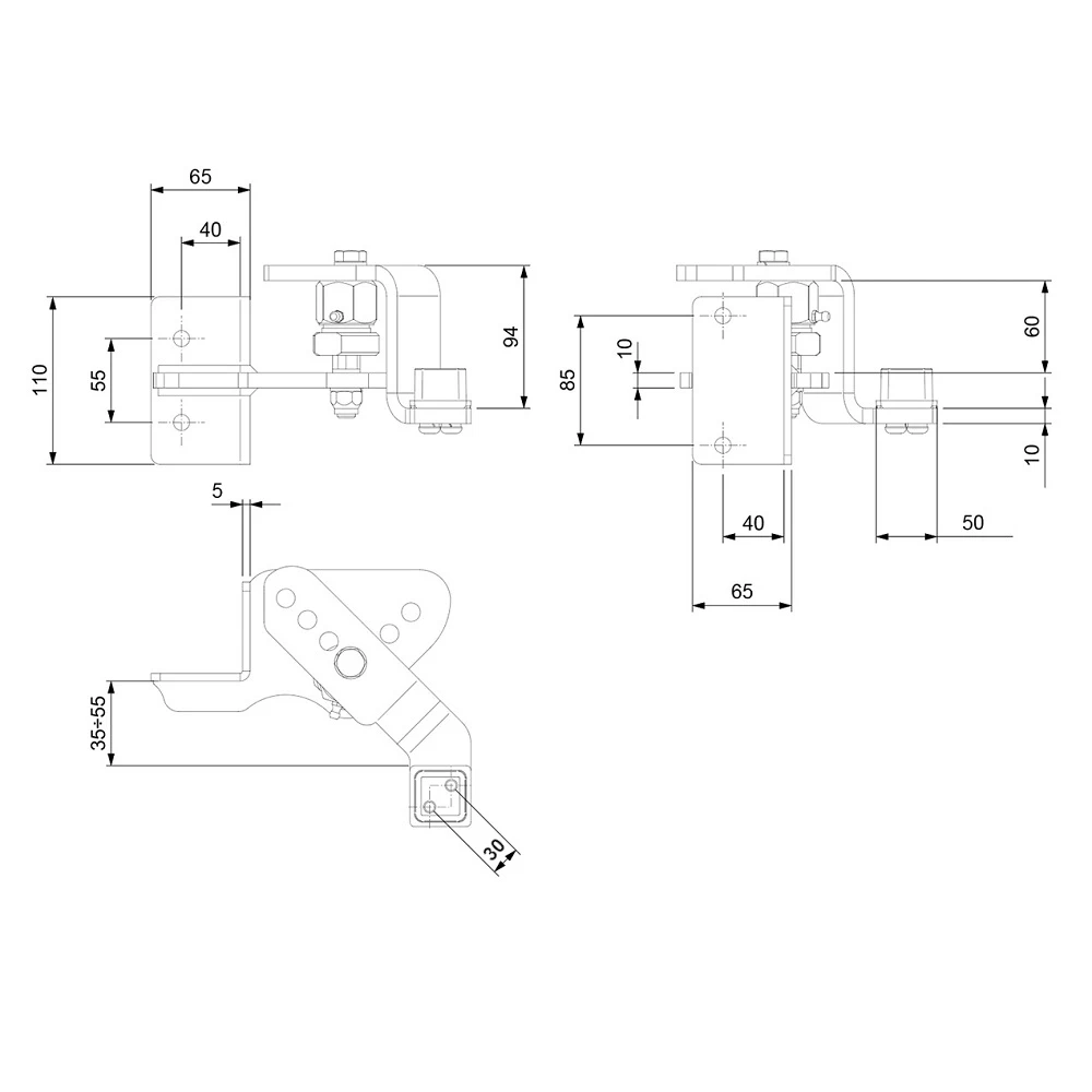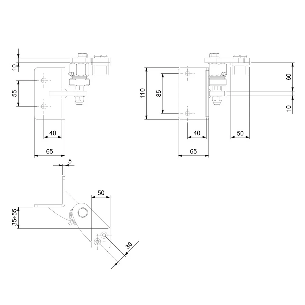 - Entraxe des trous de montage (vertical) : 55 mm (support) / 85 mm (plaque latérale)