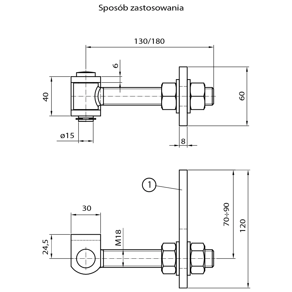 Le connecteur se monte sur le vantail du portail ou du portillon, et la tige de charnière M18 passe à travers l'orifice oblong et est fixée par des écrous des deux côtés. Le schéma d'utilisation montre deux variantes de longueur de tige (130 mm ou 180 mm), ce qui permet de choisir la charnière appropriée selon l'épaisseur du montant ou du cadre. Le manchon de charnière (hauteur 40 mm, axe Ø15 mm) est soudé au montant, et le connecteur avec orifice oblong permet un réglage fluide de la position du vantail.