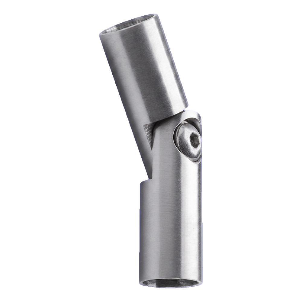 Le raccord est fabriqué en acier inoxydable de haute qualité AISI 304 avec finition satinée, ce qui assure une haute résistance à la corrosion et un aspect cohérent avec les autres éléments de balustrades en acier brossé. L'angle de réglage est ajusté à l'aide d'une vis à six pans creux, permettant un montage rapide et sûr sans outils spécialisés.
