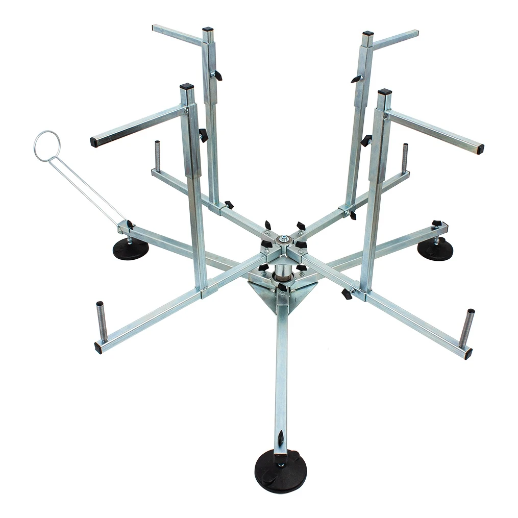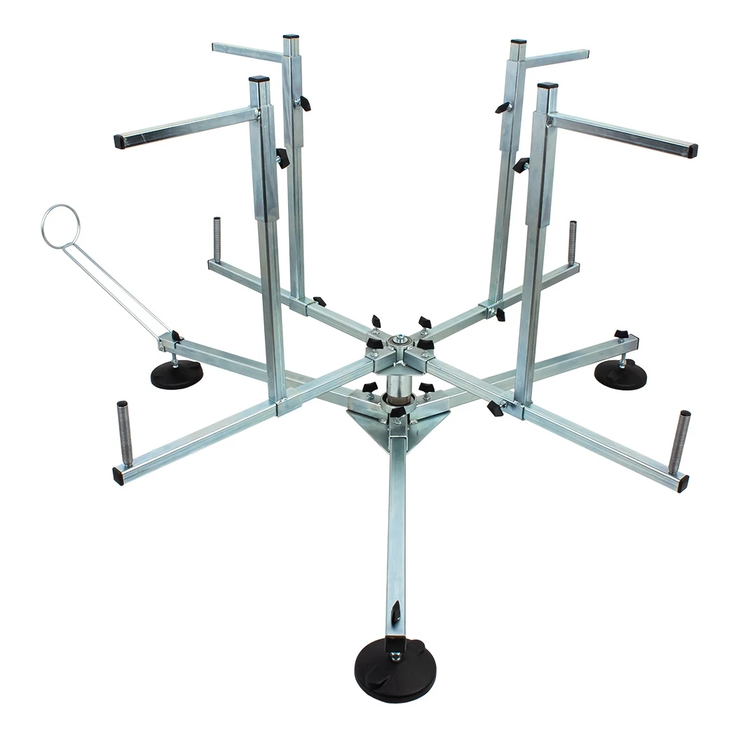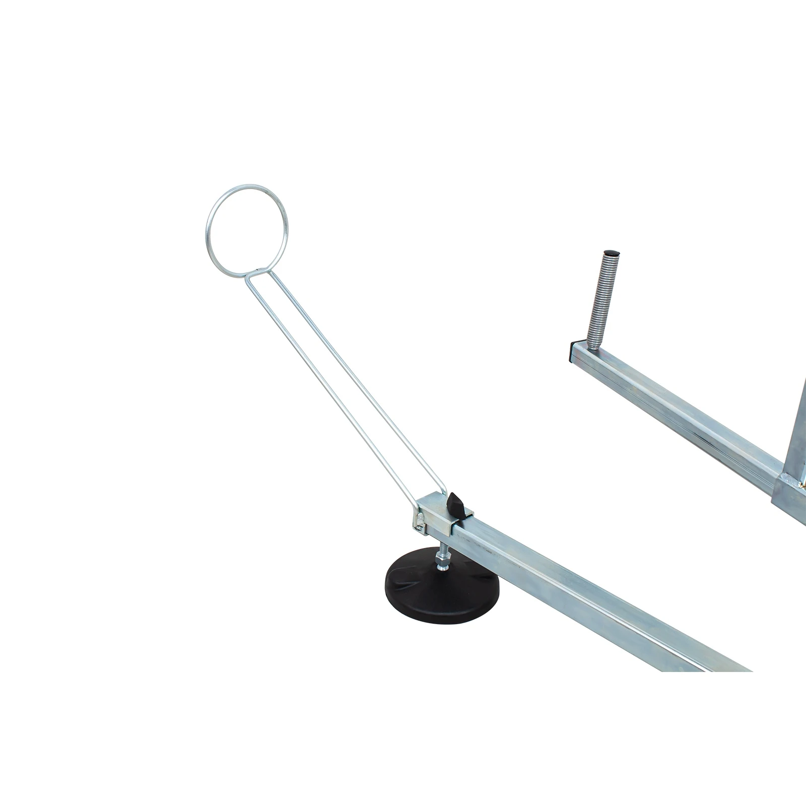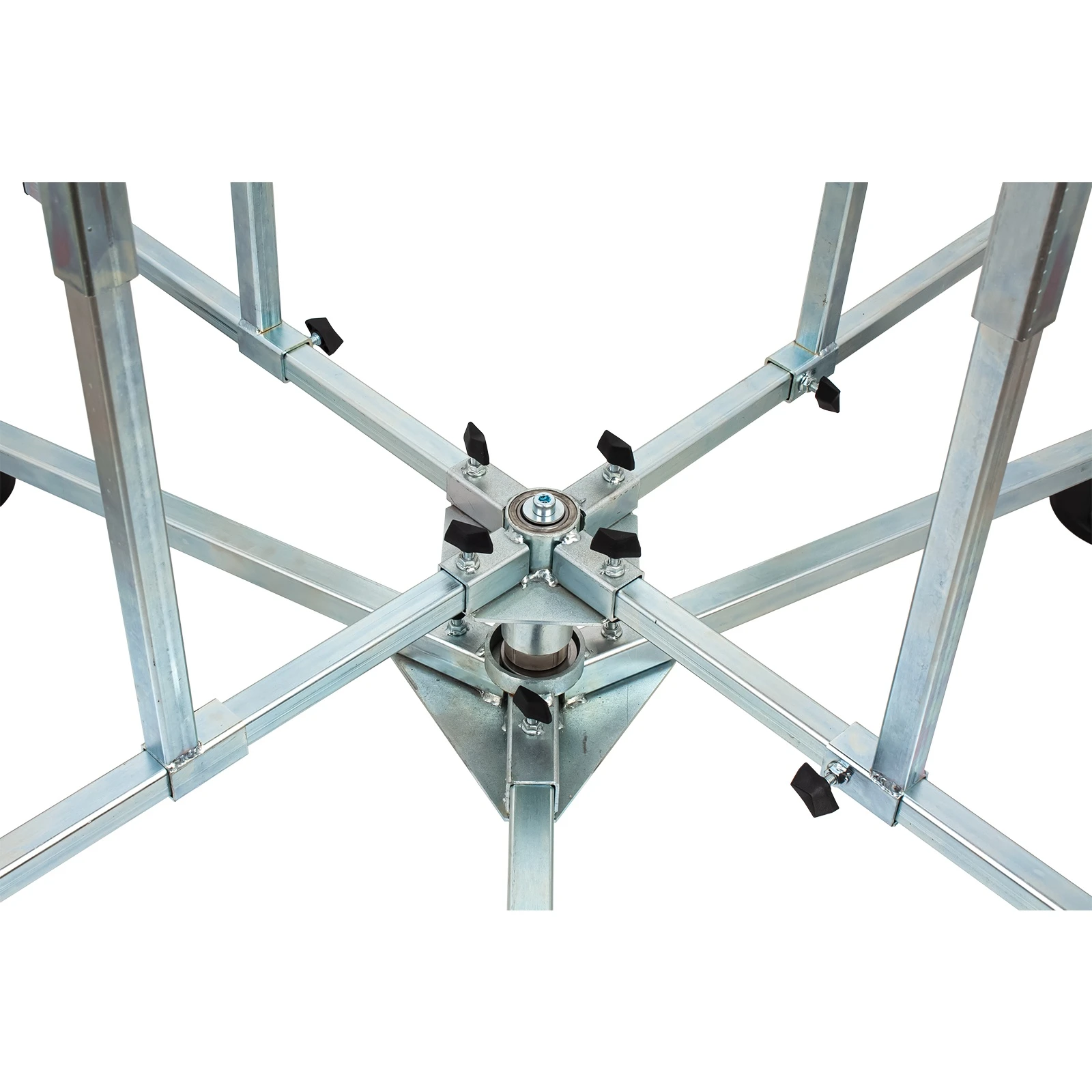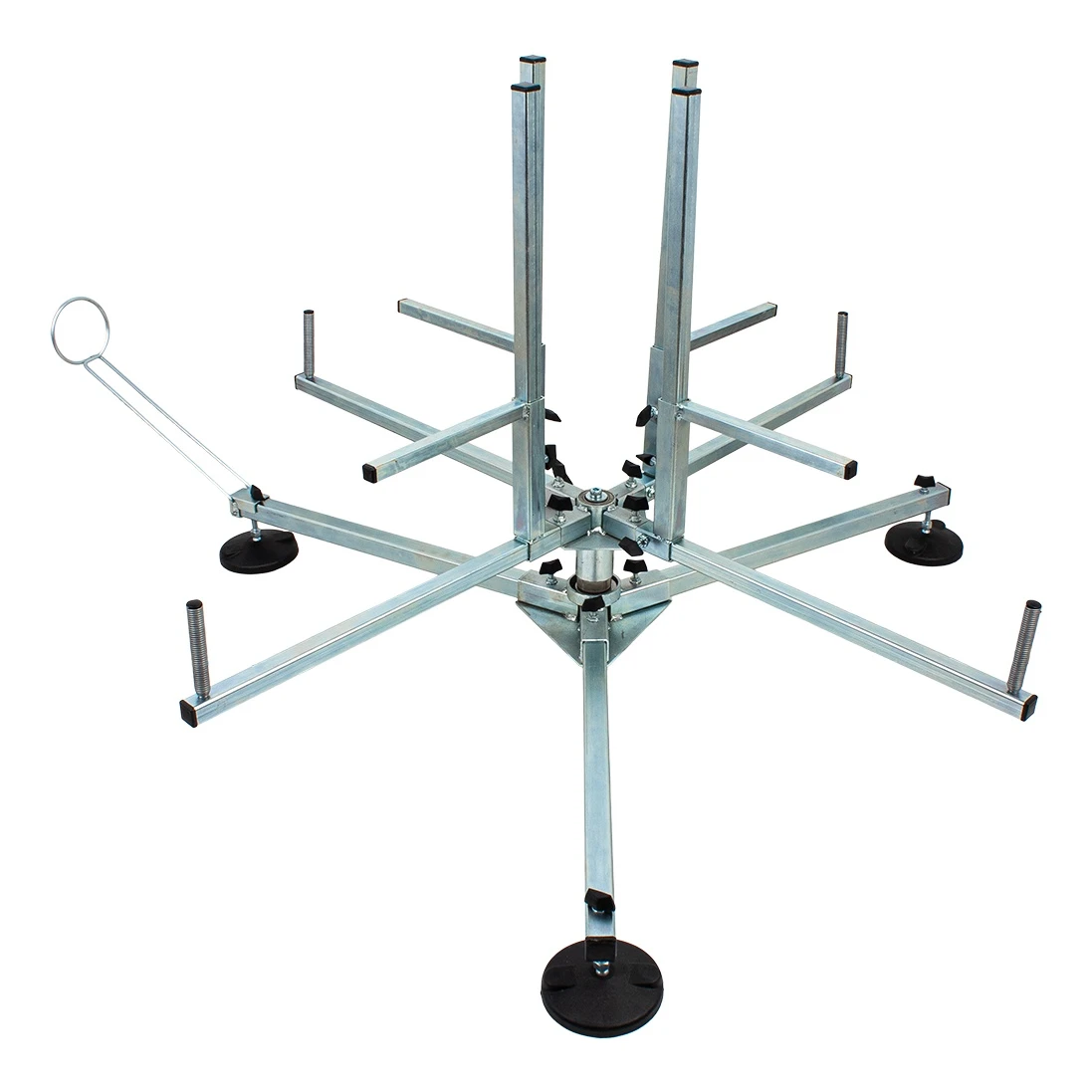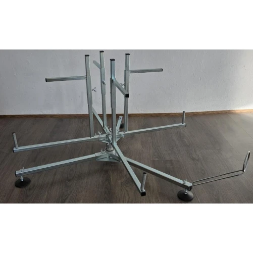 La structure est fabriquée en profilés acier galvanisé de haute qualité, ce qui garantit une durabilité sur de nombreuses années, même lors d'une utilisation intensive sur les chantiers. La base étoilée stable avec pieds réglables assure un appui solide sur tout type de surface.