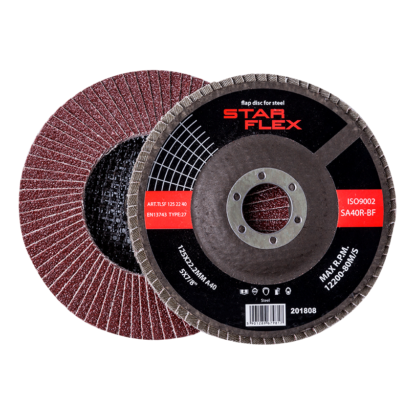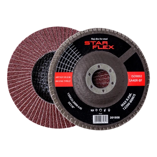 Disque à lamelles Star Flex T29 de diamètre 125 mm et grain 40 — outil abrasif haute qualité avec revêtement corindon, conçu pour l'usinage intensif de l'acier. La construction inclinée de type T29 assure un contact optimal avec le matériau à un angle de travail de 10°–25°, ce qui se traduit par un meulage efficace des arêtes, un chanfreinage et l'élimination des soudures sans pression excessive.