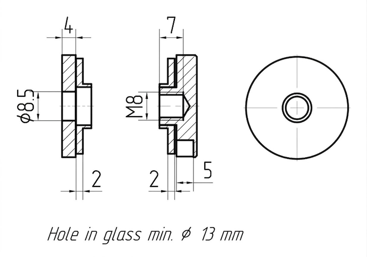 La fixation est destinée aux verres d'épaisseur de 4 mm à 16,76 mm (y compris verre feuilleté VSG). Le diamètre minimum du perçage de montage dans le verre est de ø 13 mm. Grâce au filetage universel M8, l'élément s'intègre facilement avec les systèmes typiques de garde-corps inoxydables montés sur murs, poteaux et constructions planes.