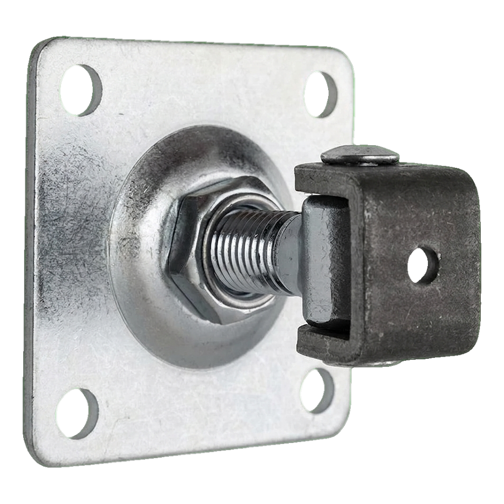 Gond réglable en acier PSG avec vis M18 destiné au montage de portails battants et portillons. La platine aux dimensions 80×80 mm avec quatre trous de montage assure une fixation stable et sûre au poteau. Grâce au réglage fileté, le gond peut être précisément mis à niveau à tout moment — aussi bien lors du montage qu'après des années d'utilisation, lorsque la construction s'affaisse ou se déforme thermiquement.