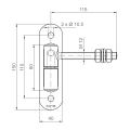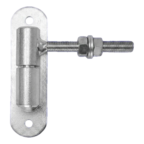 Le gond se compose de deux douilles en acier roulé montées sur un axe de rotation commun, reliées à un écusson de montage. L'axe horizontal avec filetage M12 se termine par une rotule sur laquelle la partie correspondante du portillon est installée. L'écrou de réglage sur l'axe permet un réglage continu de la hauteur de suspension du portillon – il suffit de desserrer l'écrou, régler la position appropriée et resserrer. Cette construction élimine la nécessité de démonter lors de la correction du réglage, ce qui est particulièrement utile après affaissement de la structure ou dans des conditions de grands changements de température, lorsque le métal change ses dimensions.