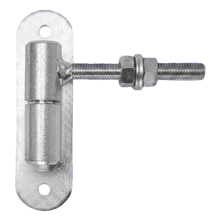Gond réglable roulé en acier avec rotule et écusson de montage – solution fiable pour la suspension de portillons de clôture. Le filetage M12 avec écrou de réglage permet un réglage précis de l'aplomb du portillon à tout moment – aussi bien juste après le montage que pendant l'exploitation, lorsque la structure s'affaisse ou que les conditions thermiques changent.