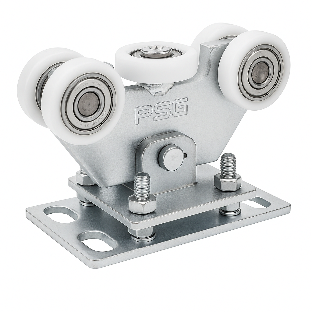 Le chariot roulant est équipé de 5 galets en matière plastique, dont un galet horizontal, assurant un déplacement fluide et silencieux du portail. La construction oscillante — le chariot est relié à la base par un axe — lui permet de s'adapter automatiquement au profil du rail. Le réglage en hauteur par vis permet un positionnement précis du portail. Le chariot est conçu pour un rail 70×70×4 mm. L'ensemble est fabriqué en acier galvanisé, garantissant une résistance à la corrosion et une exploitation durable en extérieur.