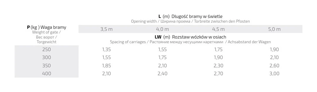 L'écartement correct des chariots roulants en axes (LW) dépend du poids du portail (P) et de la largeur de passage en lumière (L). Le tableau ci-dessous présente les valeurs recommandées :