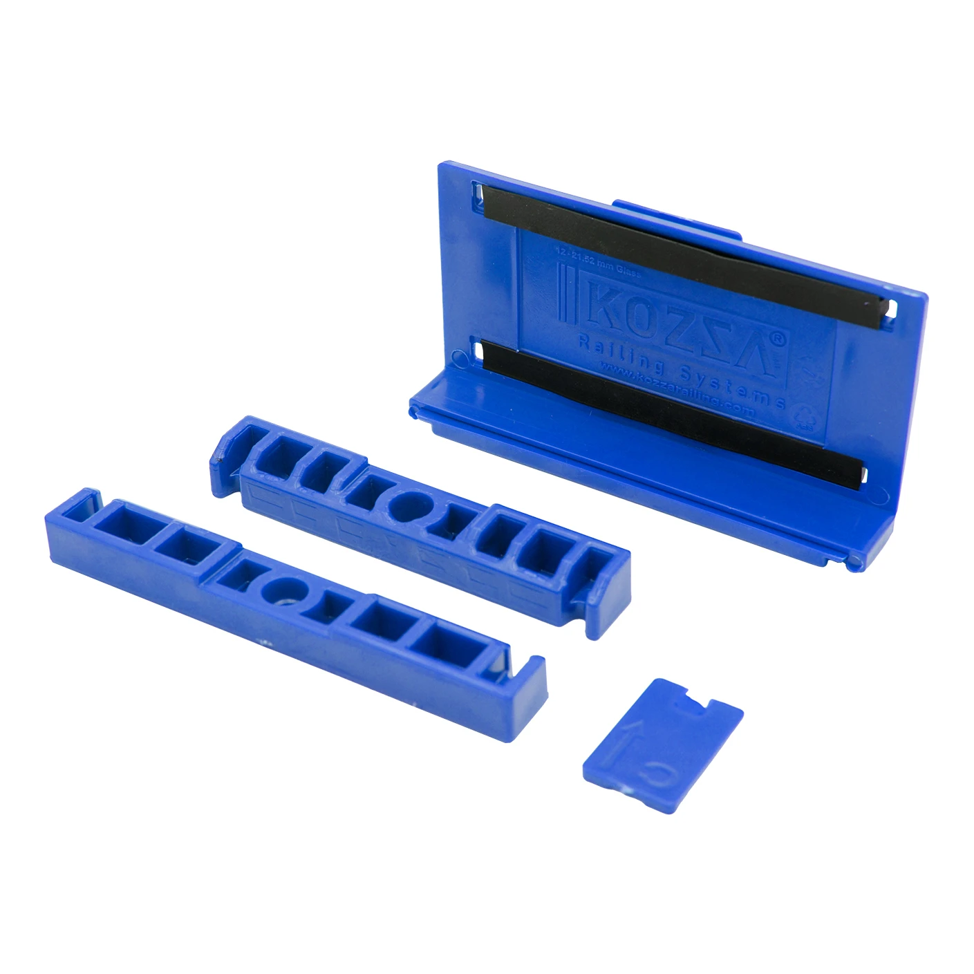 Le kit comprend 15 jeux d'éléments de fixation en plastique, répartis uniformément sur toute la longueur du profilé. Chaque jeu se compose d'une embase repérée A et B ainsi que d'une cale d'écartement, facilitant une pose correcte et garantissant une répétabilité à chaque installation. Les éléments sont fabriqués en matière plastique robuste — résistants à la déformation, ils assurent une fixation fiable du panneau de verre aussi bien latéralement que par le dessus du profilé.
