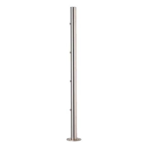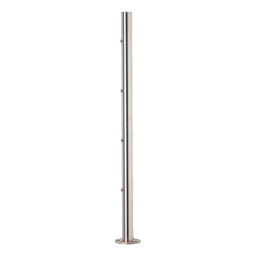 L'acier inoxydable AISI 304 assure une haute résistance à la corrosion et aux conditions atmosphériques, permettant ainsi au poteau de convenir aussi bien à l'intérieur des bâtiments qu'à l'extérieur — sur les balcons, terrasses ou cages d'escalier. La finition satinée de la surface confère au produit un aspect moderne et mat qui se marie parfaitement avec les autres éléments des systèmes de balustrades.
