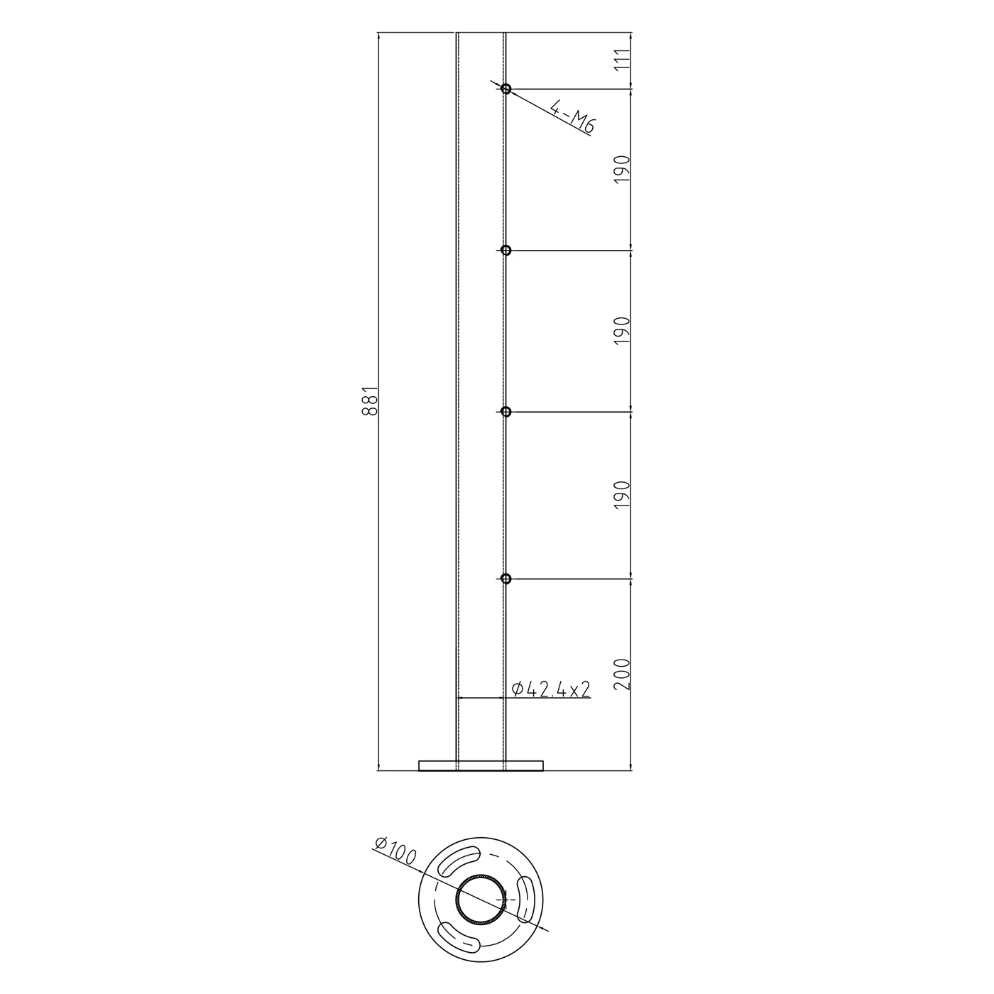 La base de montage soudée de diamètre ø100 mm avec trois trous oblongs répartis tous les 120° se fixe directement au sol. Ce mode de montage garantit la stabilité et la sécurité de la construction même dans les lieux à forte circulation, tels que les escaliers d'établissements recevant du public, les hôtels ou les bâtiments de bureaux.
