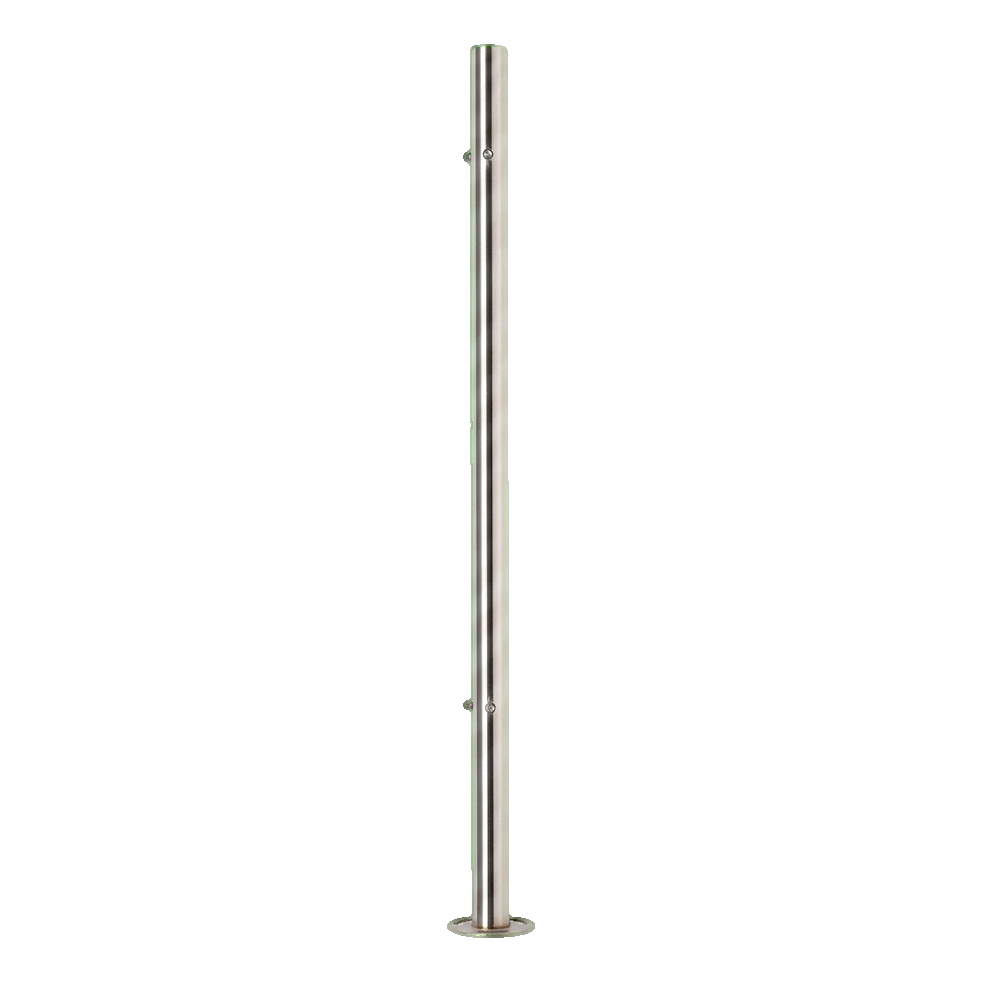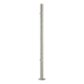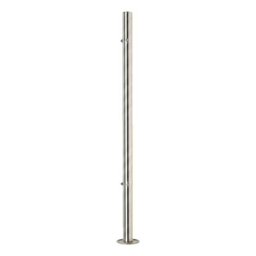 Le poteau est équipé de 4 trous filetés M8 usinés avec précision répartis en deux paires à 90°, permettant la fixation stable de supports pour barres ou tubes de remplissage de balustrade. La base de montage soudée de diamètre ø100 mm avec trois trous oblongs assure une fixation sûre et durable au sol. Le poteau est compatible avec le système de balustrade standard 42,4 mm.