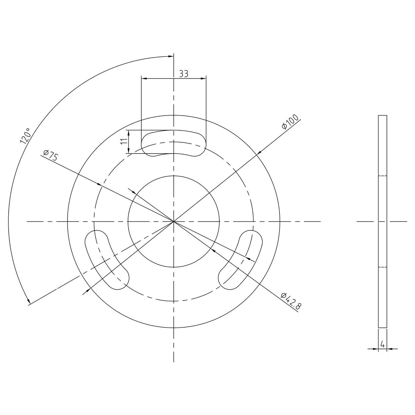 - Trous de montage : 3 trous oblongs (33 × 11 mm) sur diamètre de répartition ø75 mm, espacés de 120°