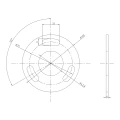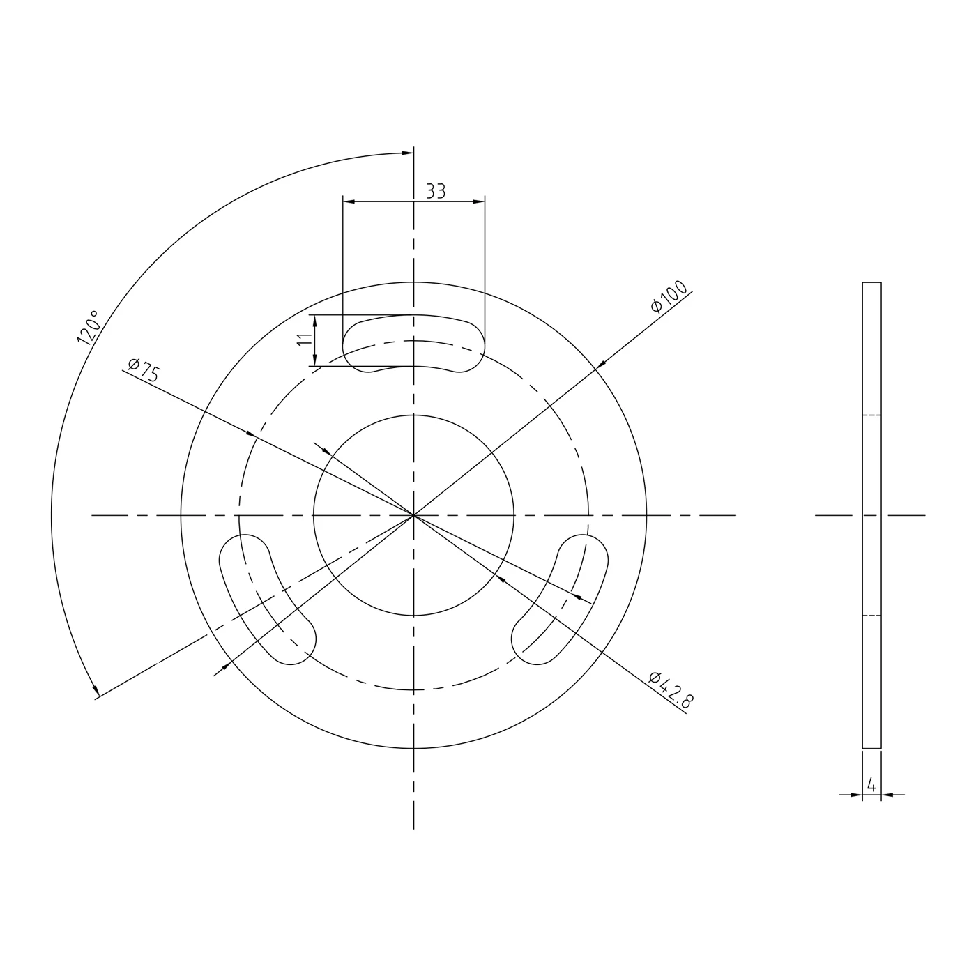 - Angle de répartition entre les perçages : 120° (3 perçages de montage)