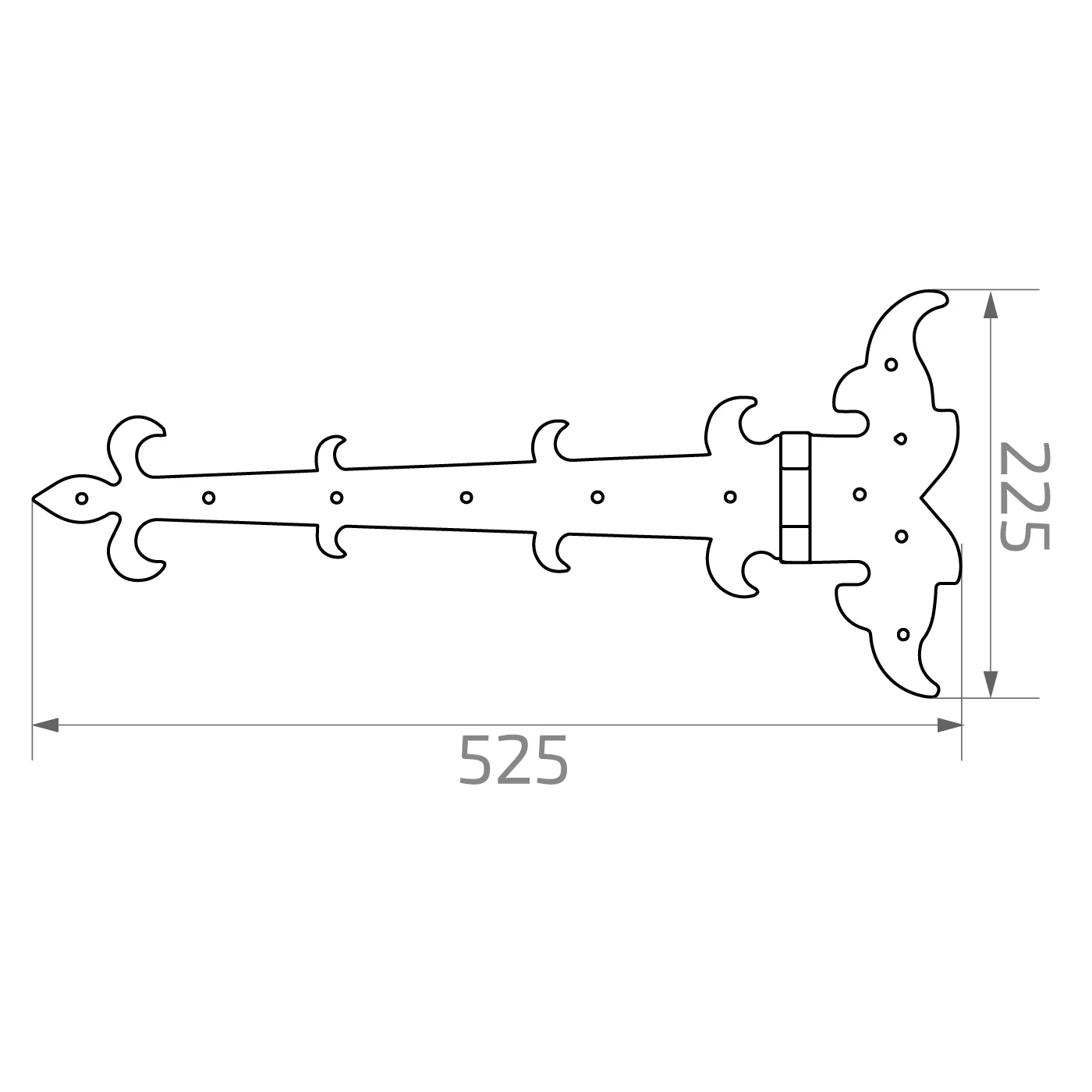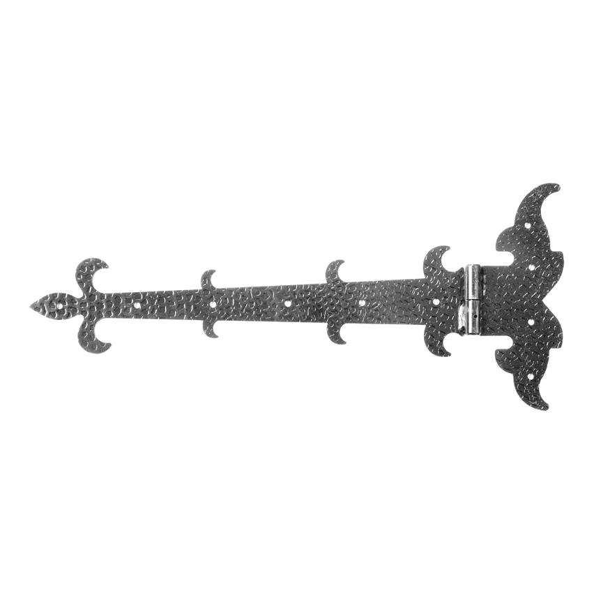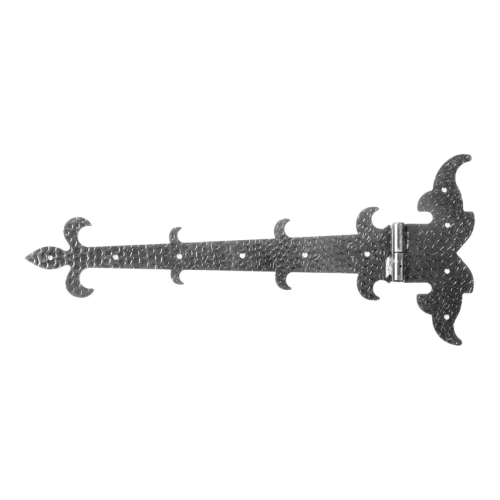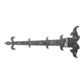 La charnière décorative à penture droite POSTAL est un élément de ferrure en acier au design décoratif traditionnel, destiné au montage sur portails, portillons, portes en bois et autres constructions nécessitant une finition classique. Grâce aux finitions décoratives style fleur de lys héraldique et à la surface texturée rappelant le martelage, la charnière confère aux objets un caractère noble et artisanal.