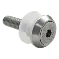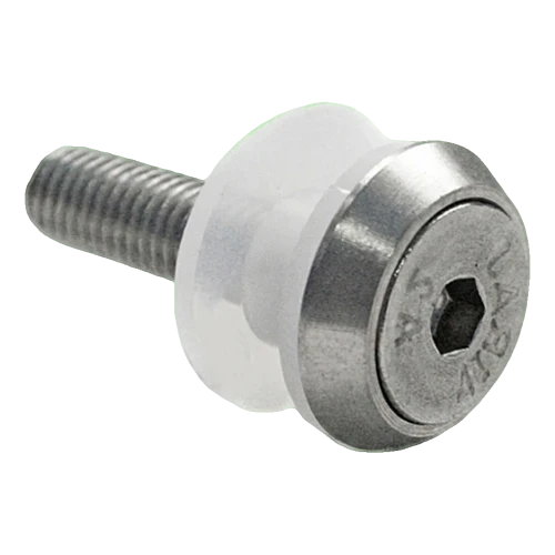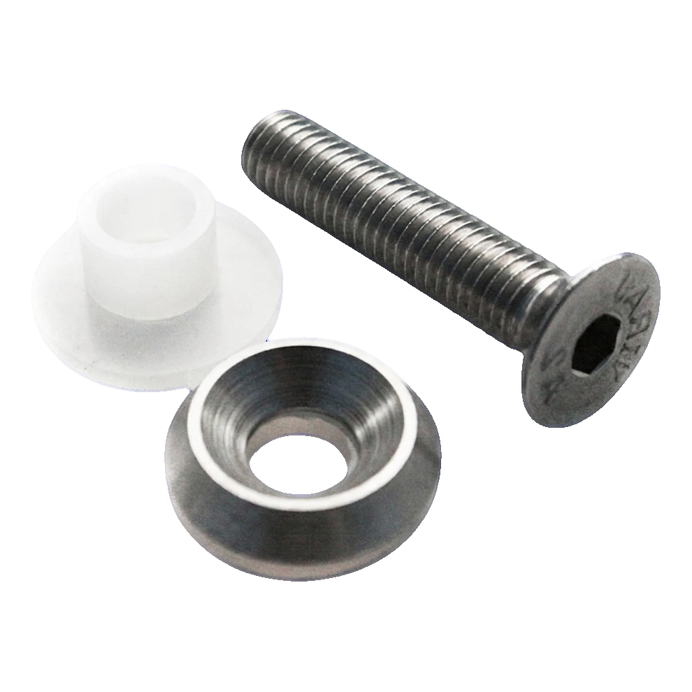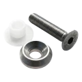 Ensemble destiné à la fixation de panneaux de verre dans les garde-corps en acier inoxydable montés sur surfaces planes. La tête fraisée de la vis DIN 7991 se loge dans la rondelle conique, créant une surface lisse et élégante du côté visible. La douille isolante en matière plastique traverse le trou dans le verre et assure une séparation complète des matériaux — élimine le risque de fissures thermiques et de corrosion galvanique. Grâce à la complétude de l'ensemble, l'installateur n'a pas besoin de sélectionner séparément les rondelles et isolateurs, ce qui accélère le montage et minimise le risque d'erreurs sur le chantier.