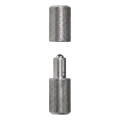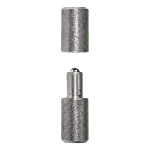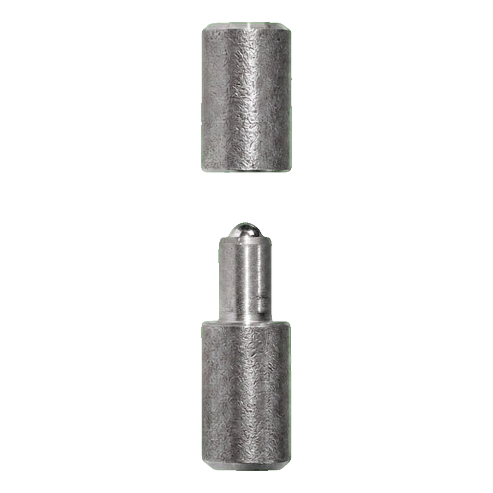 La charnière se compose de deux éléments : la douille supérieure (femelle) et l'axe avec bille (mâle), qui une fois assemblés forment un point de rotation compact et sûr. L'extrémité sphérique de l'axe minimise la friction et facilite la suspension du vantail — il suffit d'enfiler la douille sur l'axe. Cette solution est particulièrement appréciée par les équipes de montage, car elle réduit considérablement le temps d'installation des portails et portillons.