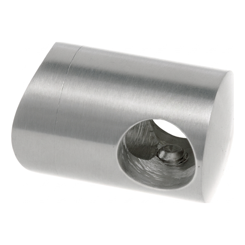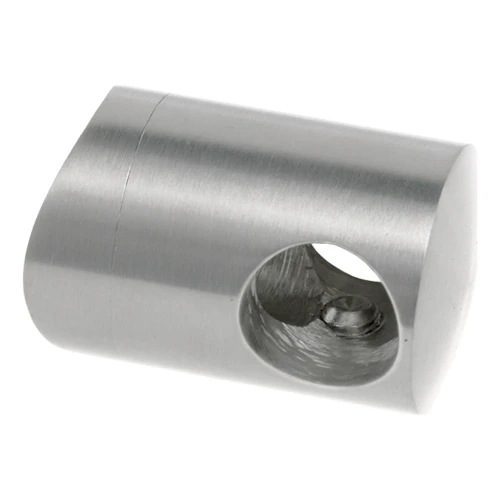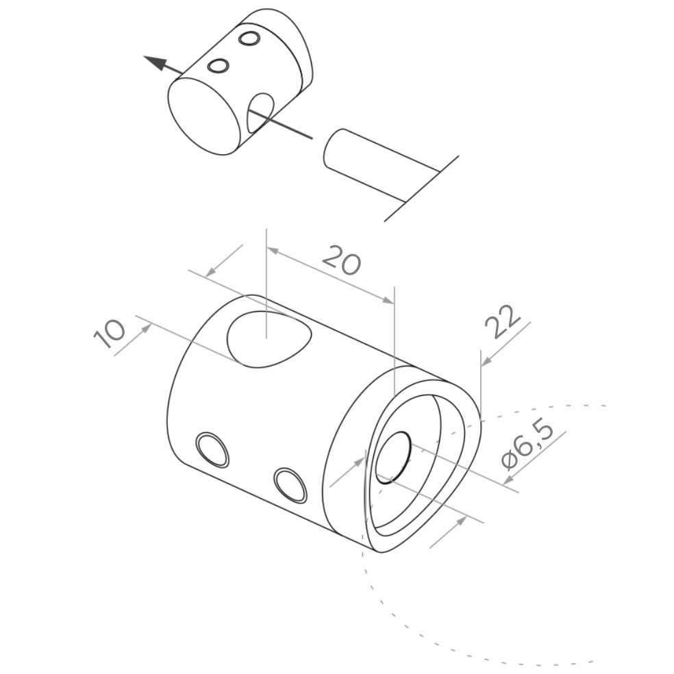 Le collier fait fonction de raccord entre le poteau de garde-corps et les tiges de remplissage — il assure la stabilité et la rigidité de toute la construction de remplissage. La base profilée (en selle) élimine la nécessité d'un fraisage précis et permet un positionnement rapide sur le tube. Le trou central Ø 6,5 mm sert à fixer le collier au tube porteur avec une vis, tandis que le trou traversant latéral Ø 10 mm guide la tige ou le tube de remplissage.