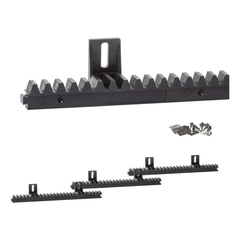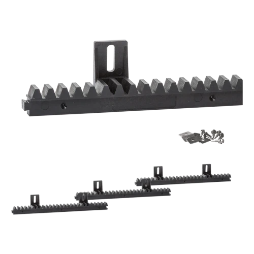 Le kit contient trois segments de crémaillère d'une longueur de 333 mm chacun, reliés entre eux par des verrous — vous obtenez ainsi rapidement une ligne dentée continue d'une longueur totale de 999 mm. Le kit comprend également des vis autoperceuses avec rondelles, permettant un montage rapide sans nécessité de perçage. Chaque segment de crémaillère est équipé de deux supports de montage, garantissant une fixation sûre et simple au vantail du portail.