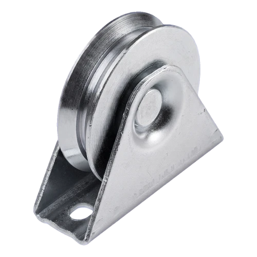 Galet de guidage en acier avec gorge en V destiné aux portails coulissants sur rail. Construction en acier galvanisé assure une haute résistance à la corrosion et un fonctionnement sans panne pendant de nombreuses années en conditions extérieures. Le galet est monté dans un support de fixation massif, ce qui garantit un guidage stable du portail sur le rail de roulement.