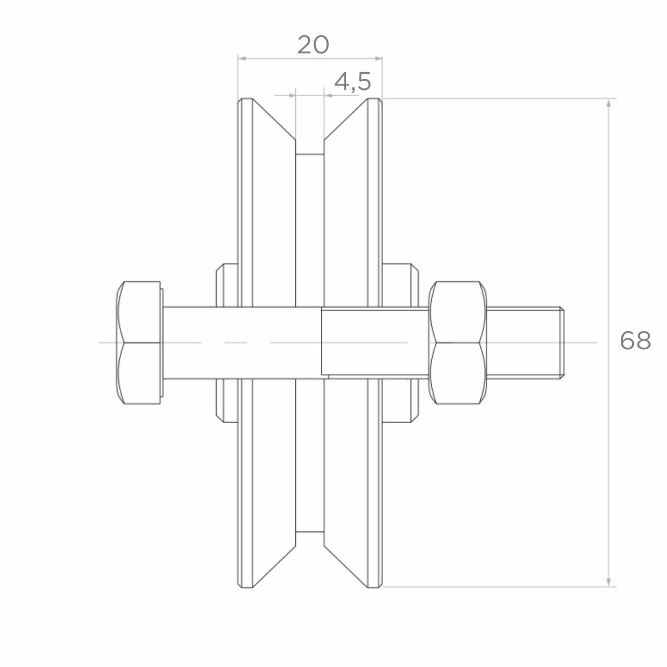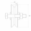 La section du galet montre le profil de rainure en V d'une largeur de fond de 4,5 mm, qui coopère précisément avec le rail de guidage. Le galet d'un diamètre de 68 mm et d'une largeur de 20 mm assure un contact optimal avec le rail, minimisant l'usure et le bruit lors du déplacement du portail. Le roulement à billes garantit de faibles résistances au roulement même à pleine charge.