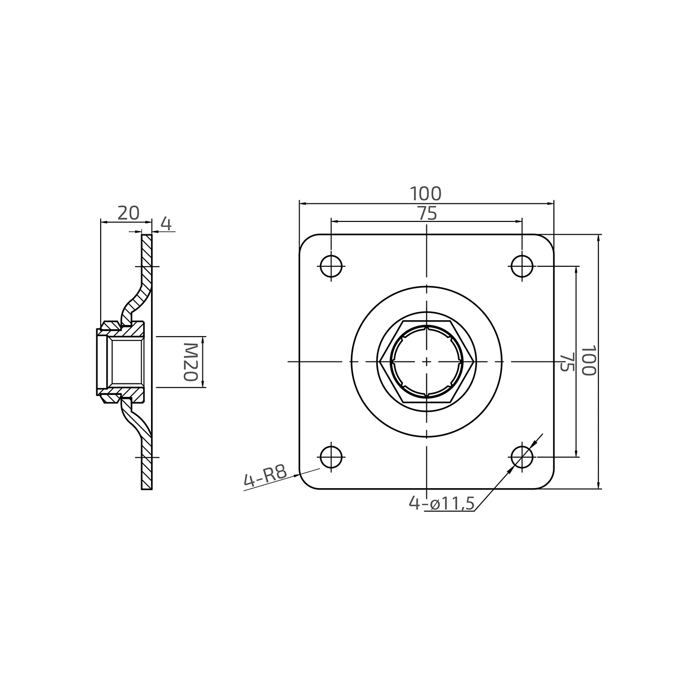 PSG plaque pour charnière réglable M20 – acier inoxydable AISI 304, 100×100 mm