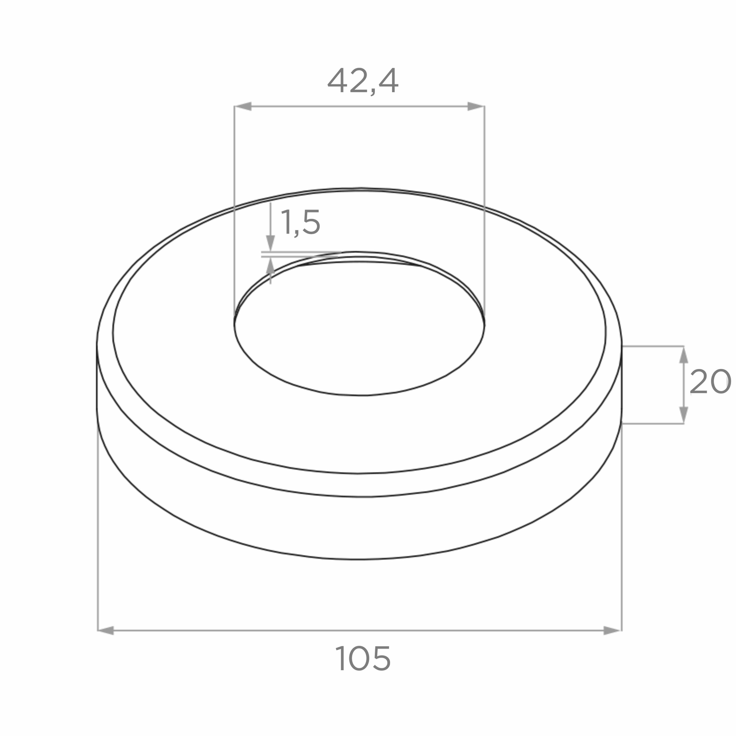 Cache de base : diamètre extérieur 105 mm, orifice intérieur ø42,4 mm, hauteur 20 mm, épaisseur de paroi 1,5 mm.