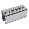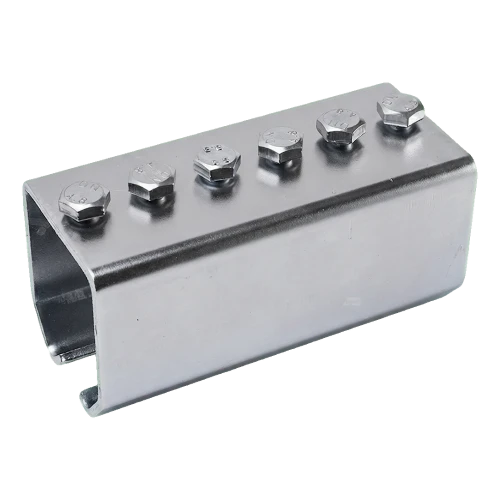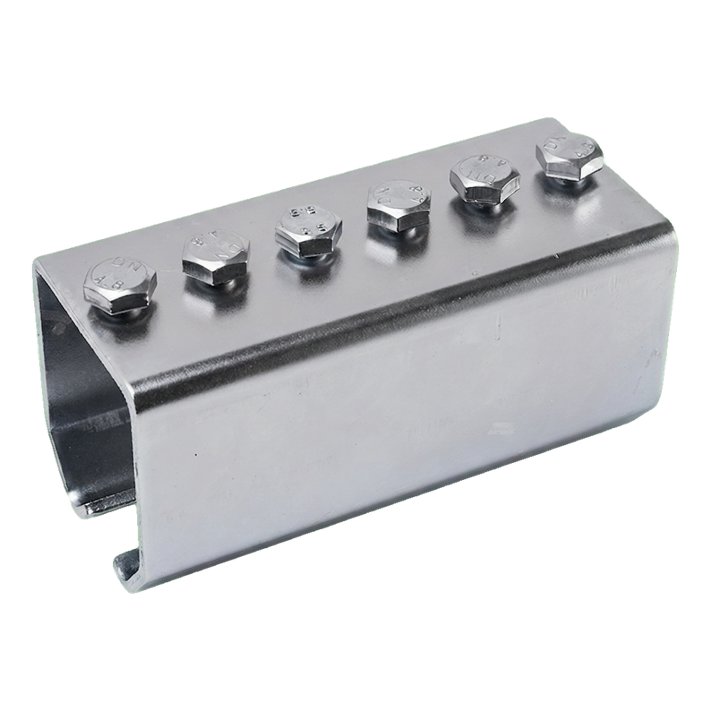 Le raccord se présente sous forme d'une pièce d'acier couvrant le profil du rail des deux côtés, ce qui garantit un raccordement rigide et stable même sous forte charge du portail. Six vis réparties uniformément sur la longueur de 160 mm assurent un serrage approprié et éliminent le risque de desserrage du raccordement pendant l'exploitation. Le revêtement galvanisé protège l'élément contre la corrosion, permettant au raccord de convenir aussi bien aux portails intérieurs de halls qu'aux applications exposées à l'humidité.
