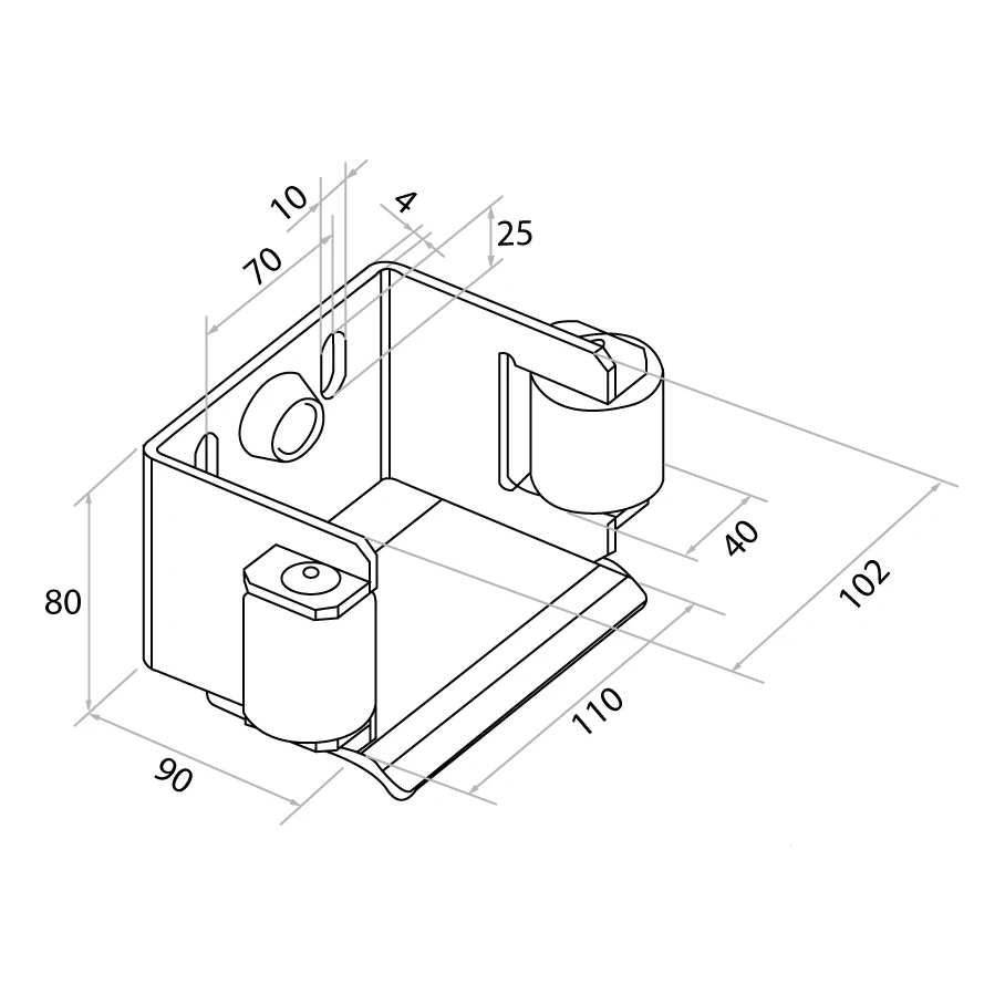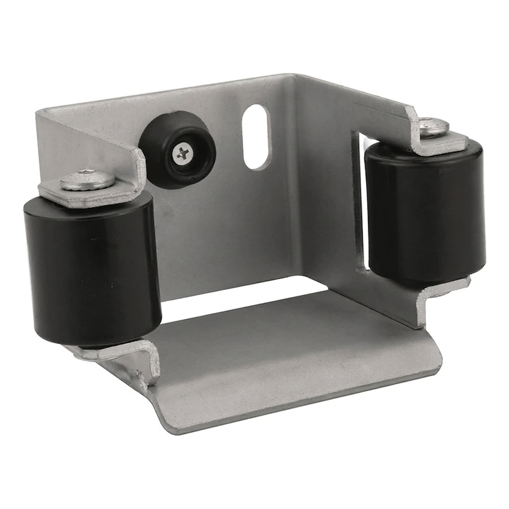 Le support est compatible avec les rails de guidage de section 80×80 mm ainsi que 70×70 mm. Deux galets de guidage en matière plastique assurent un fonctionnement silencieux et fluide du portail, minimisant la friction et l'usure du rail. Sur la paroi arrière du support se trouvent deux orifices de montage (boutonnières) permettant un réglage précis de la position, et un butoir en caoutchouc intégré amortit l'impact du vantail du portail en position fermée.