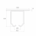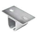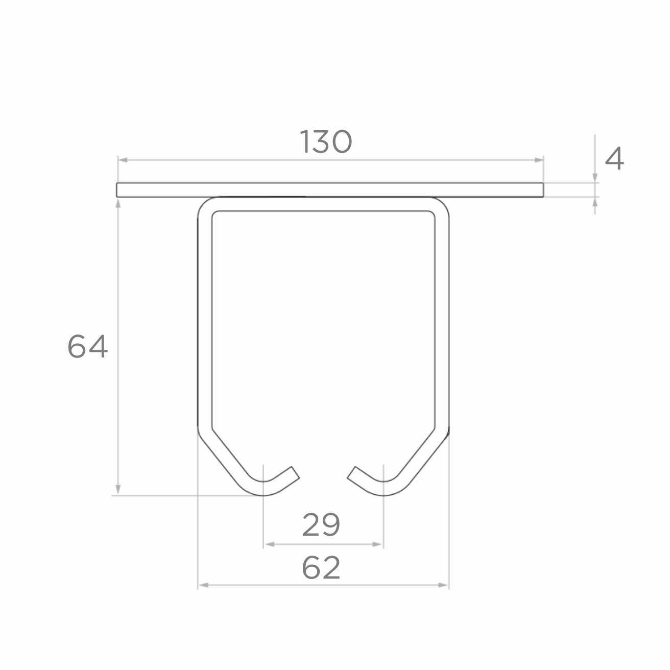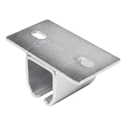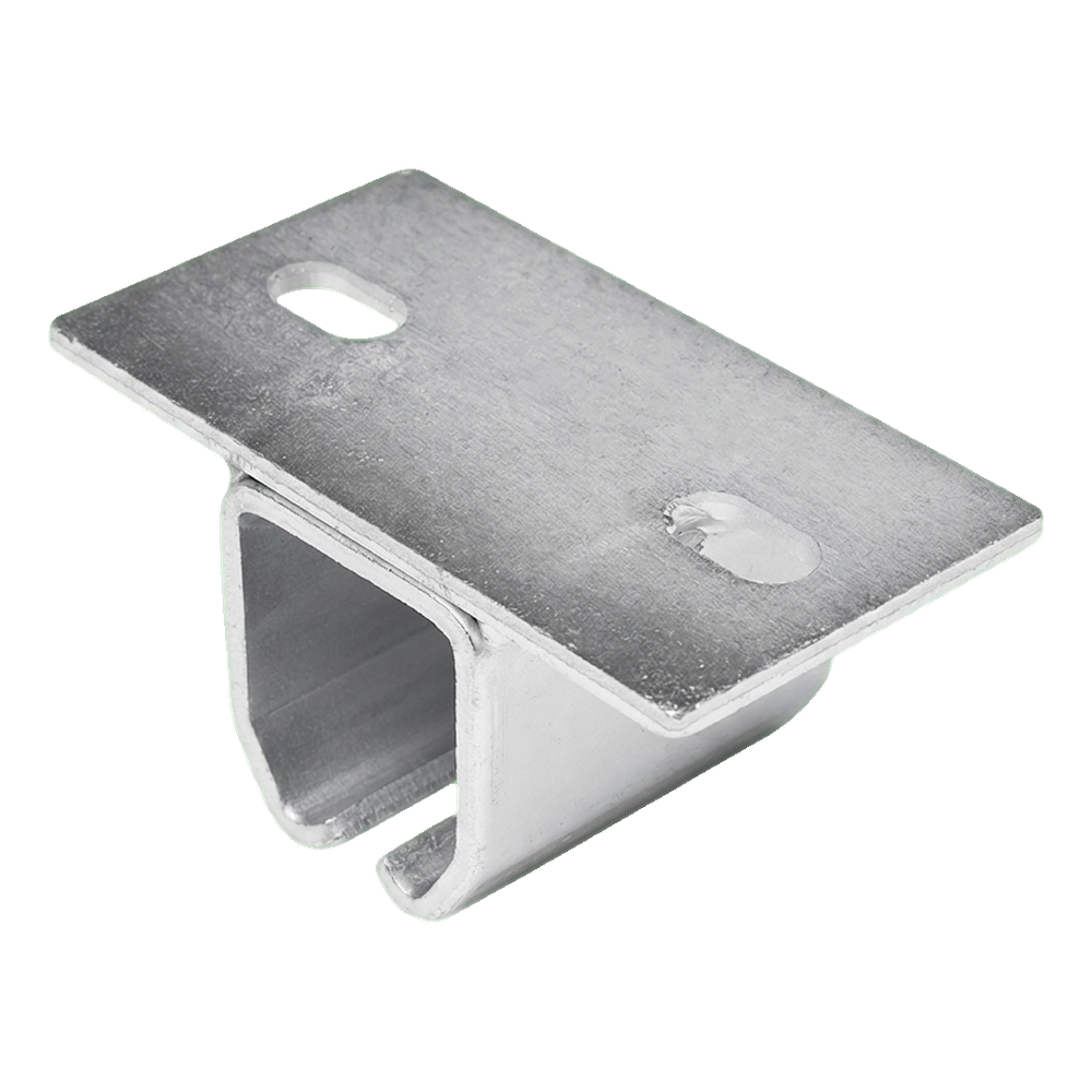 Le support possède une plaque de fixation plate avec des trous permettant de le visser au plafond ou au profilé porteur. La partie inférieure constitue une fixation en forme de C qui entoure le rail de roulement et assure un guidage stable du portail. Le profilé du support est cintré avec précision, et les bords repliés de l'ouverture inférieure augmentent la rigidité de la construction et facilitent l'insertion du rail.