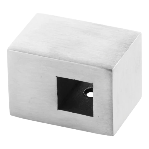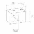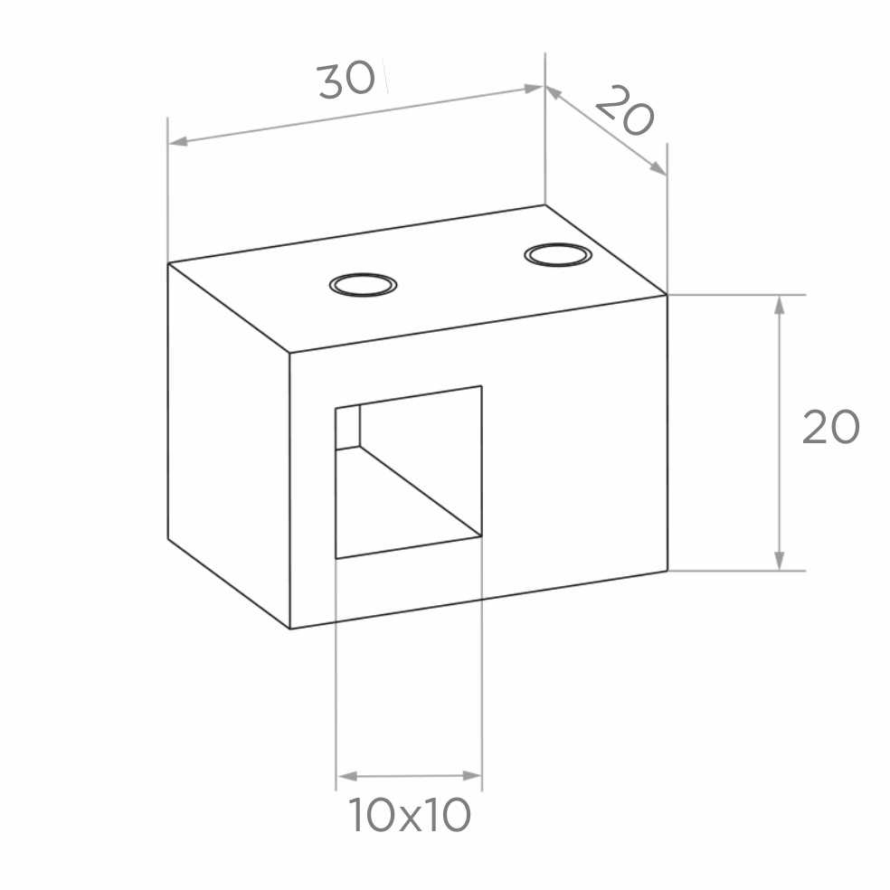 La construction du support permet un montage traversant rapide — la barre passe par l'orifice 10×10 mm, et l'ensemble est fixé sur la surface plane à l'aide de deux trous de fixation sur la face supérieure. Les dimensions compactes (30×20×20 mm) rendent cet élément discret et non dominant visuellement dans la balustrade finie.