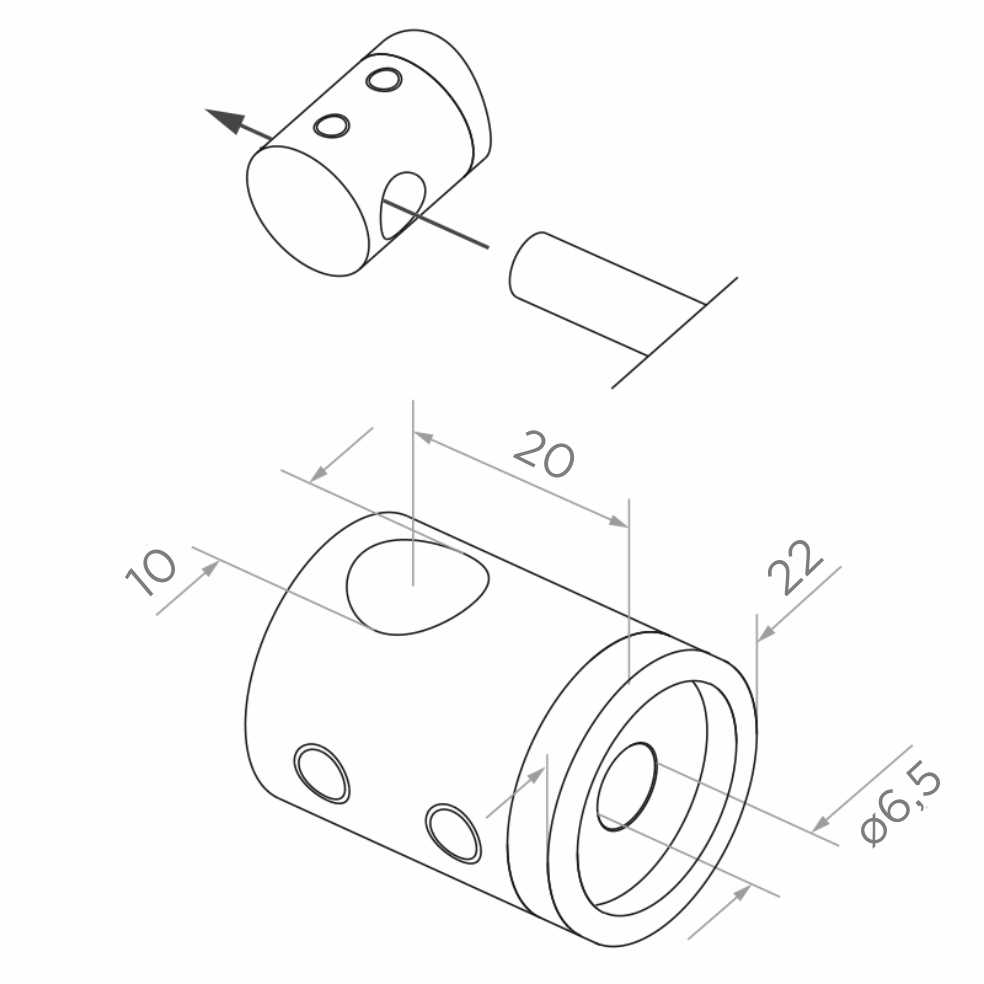 Le corps du support a la forme d'un cylindre avec un trou traversant transversal pour la tige. Le trou de montage dans l'axe de la pièce permet de visser le support sur une surface plane (ex. poteau, profilé). La vue de montage sur le dessin technique montre la façon intuitive d'insérer la tige dans le support.