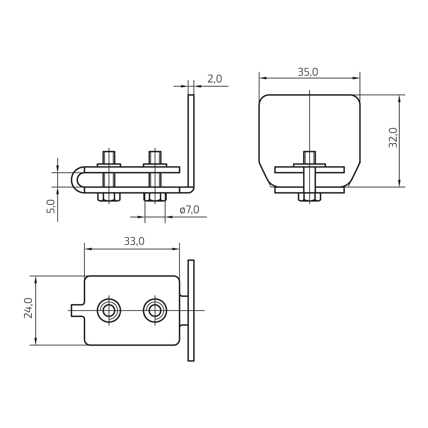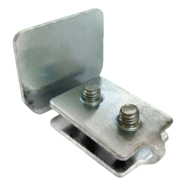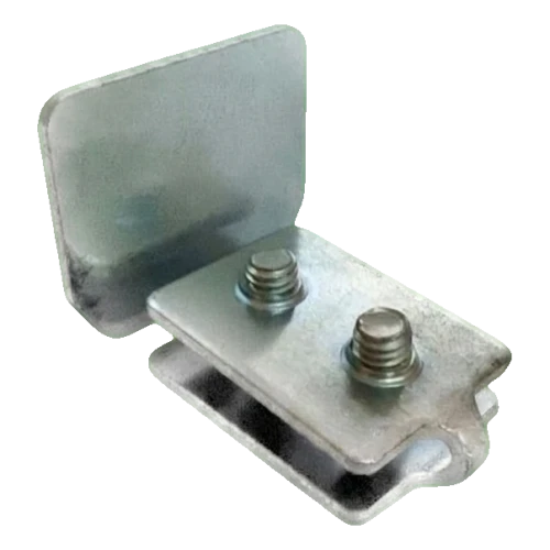 L'élément se compose d'une tôle frontale verticale de dimensions 35 × 32 mm et d'une partie horizontale insérée dans le profilé du rail, fixée par deux vis incluses dans le kit. Le montage est rapide et ne nécessite pas d'outils spécialisés supplémentaires — il suffit d'insérer l'élément dans le rail et de serrer les vis.