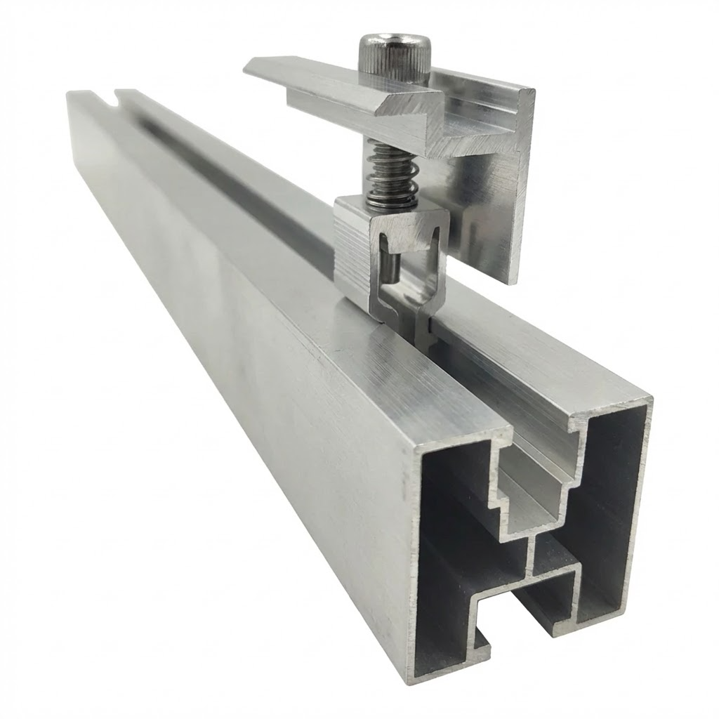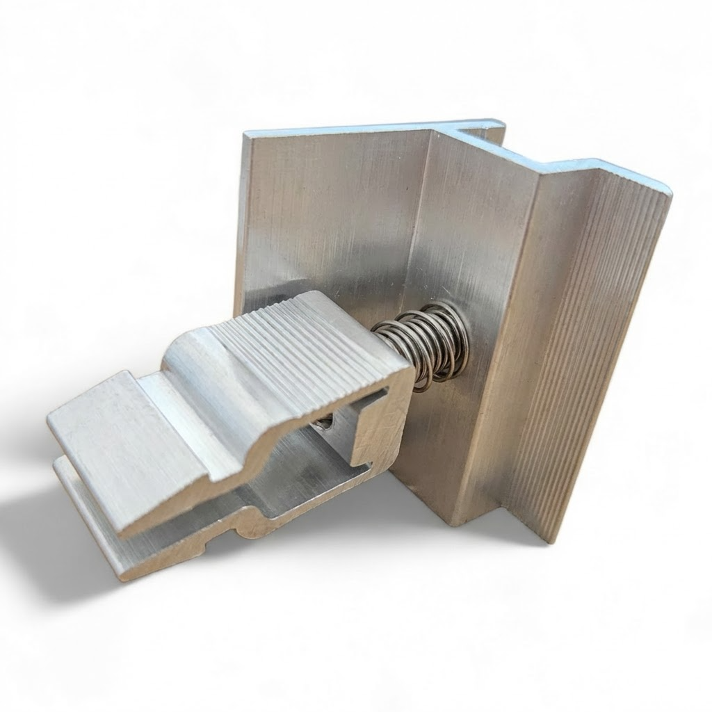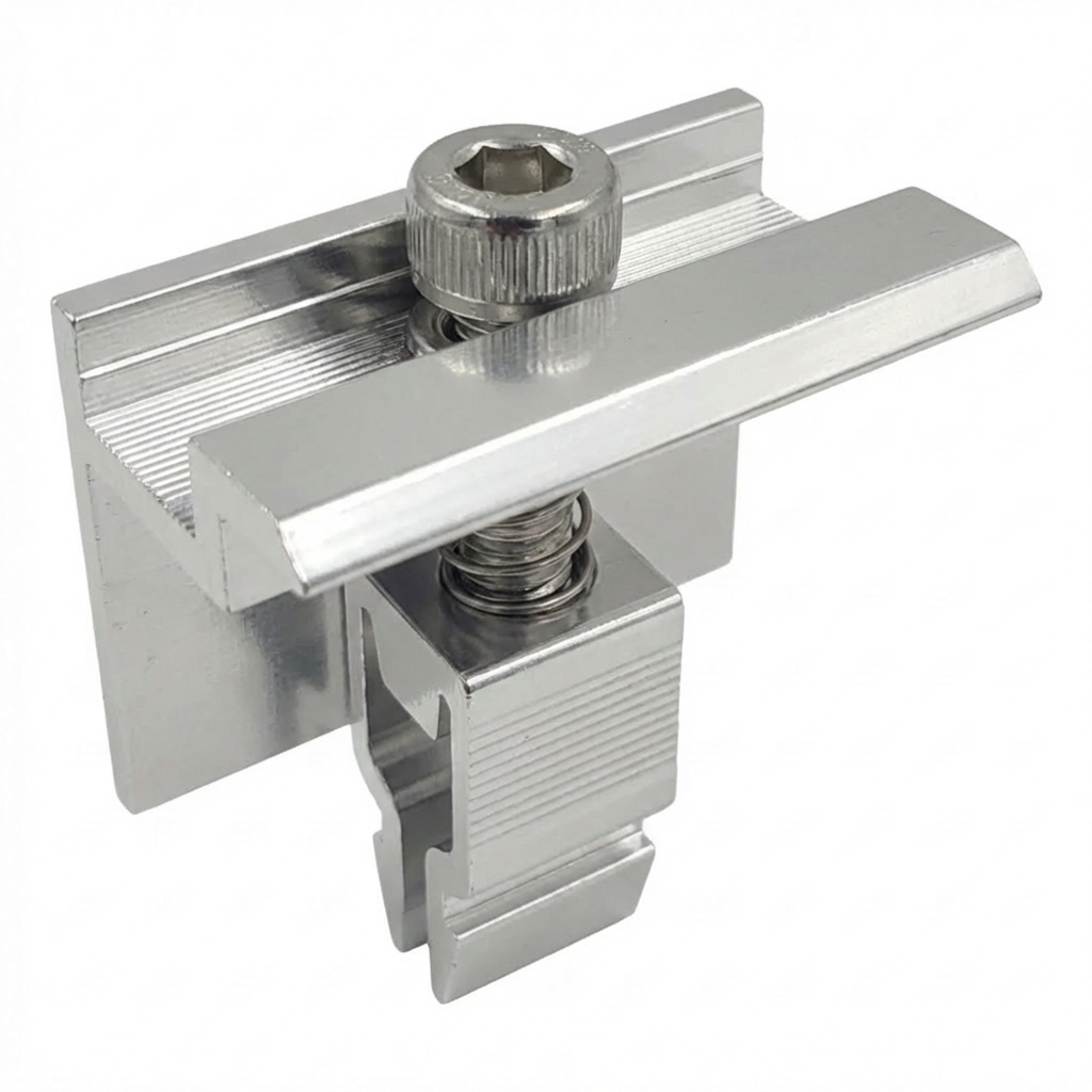 La pince est fabriquée en aluminium 6060 avec un anodisage argent, garantissant une haute résistance à la corrosion et un aspect classique et neutre, adapté à la majorité des installations PV. La finition argentée s'harmonise parfaitement avec les profilés de montage en aluminium, assurant une esthétique cohérente à l'ensemble du système.
