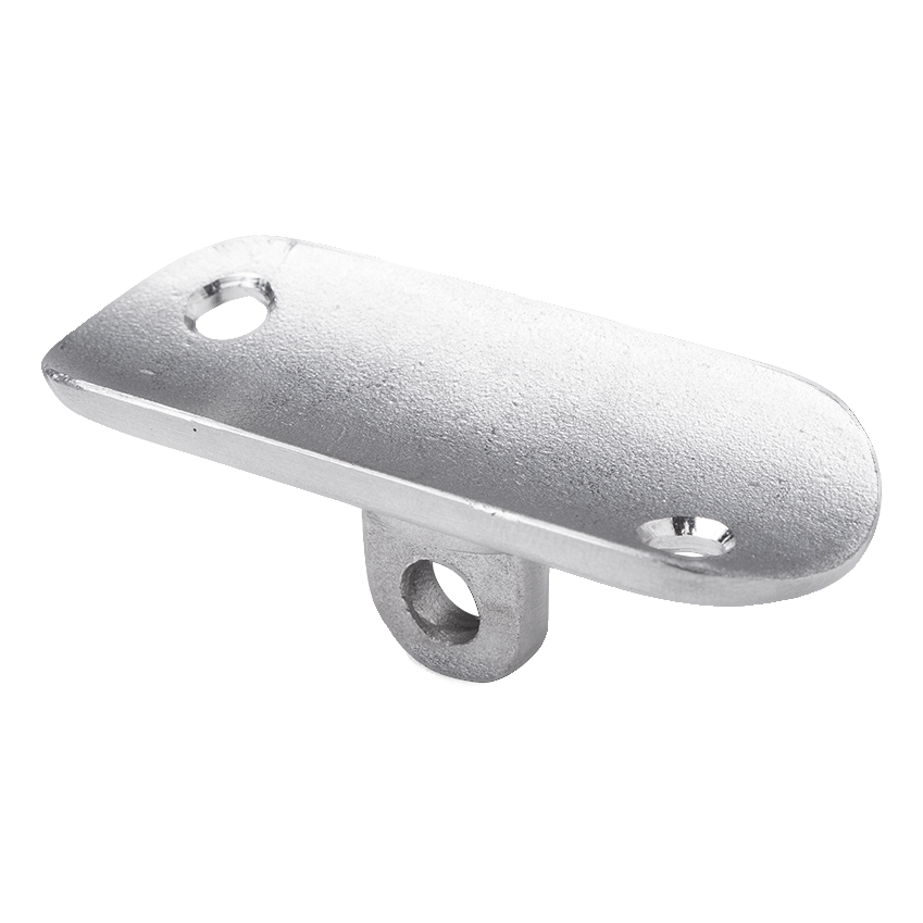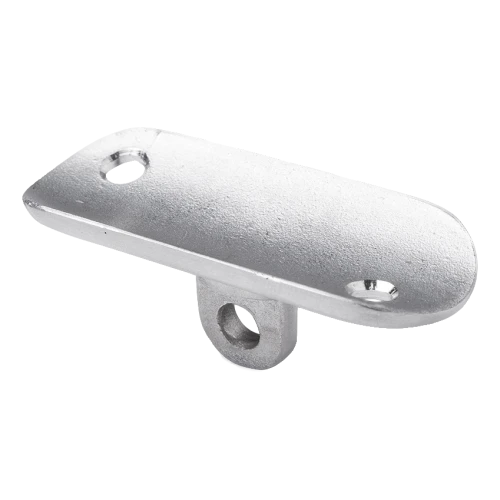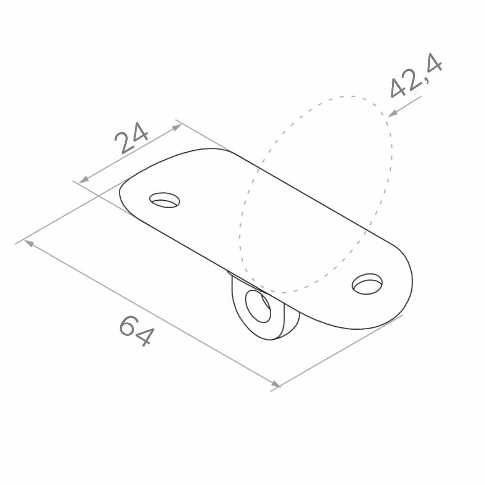La plaque est équipée de deux trous de montage dans la partie plate et d'un œil articulé dans la section inférieure, permettant le réglage de l'angle d'inclinaison de la main courante. Grâce à cela, un seul élément permet de connecter la main courante sous différents angles sans nécessiter l'utilisation d'adaptateurs supplémentaires.