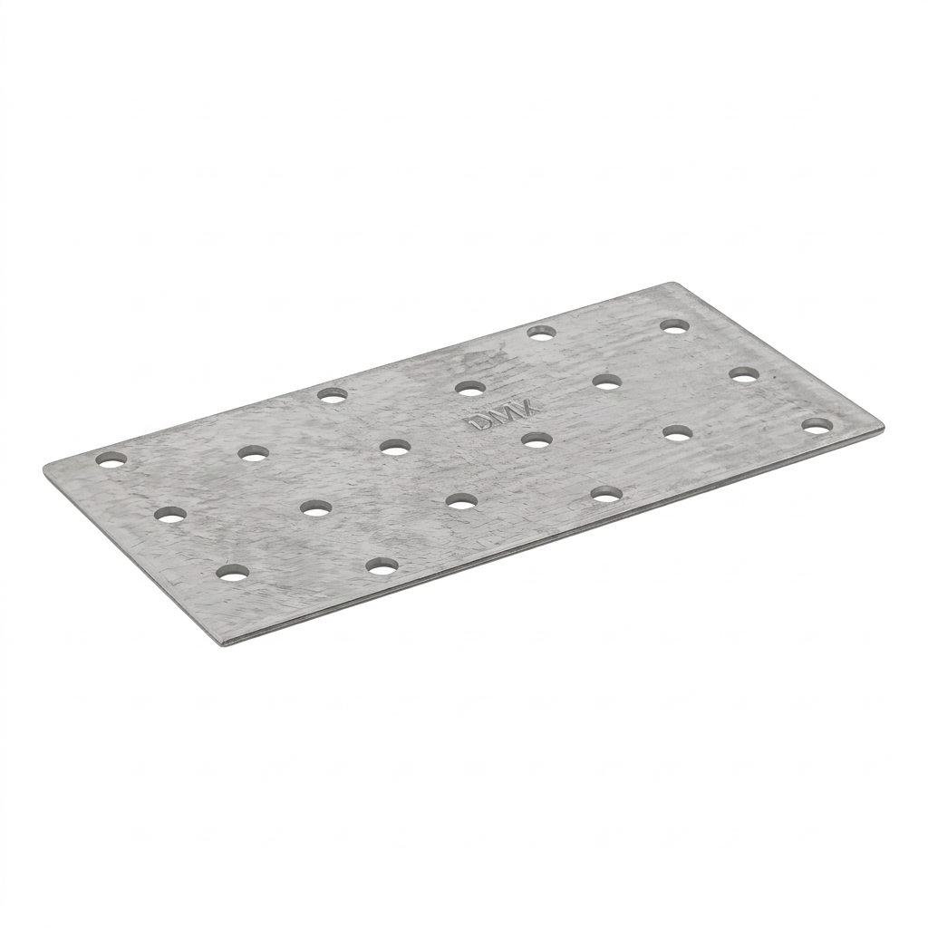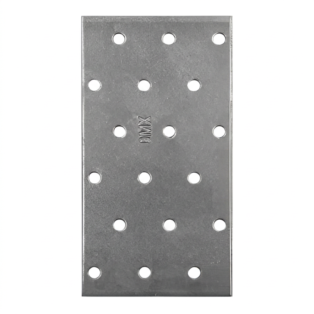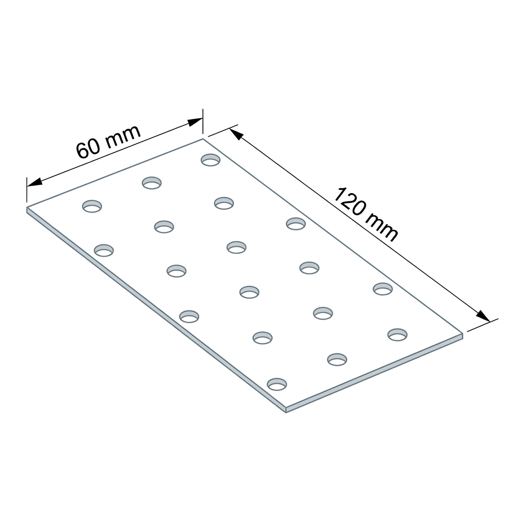 La plaque perforée 60×120 mm est un connecteur charpentier robuste destiné aux assemblages professionnels de structures en bois. Grâce à ses 18 trous d'un diamètre de 5 mm répartis uniformément sur la surface de la plaque, elle permet de réaliser aussi bien des nœuds charpentiers simples que complexes — partout où les faces latérales des éléments à assembler se trouvent dans un même plan.